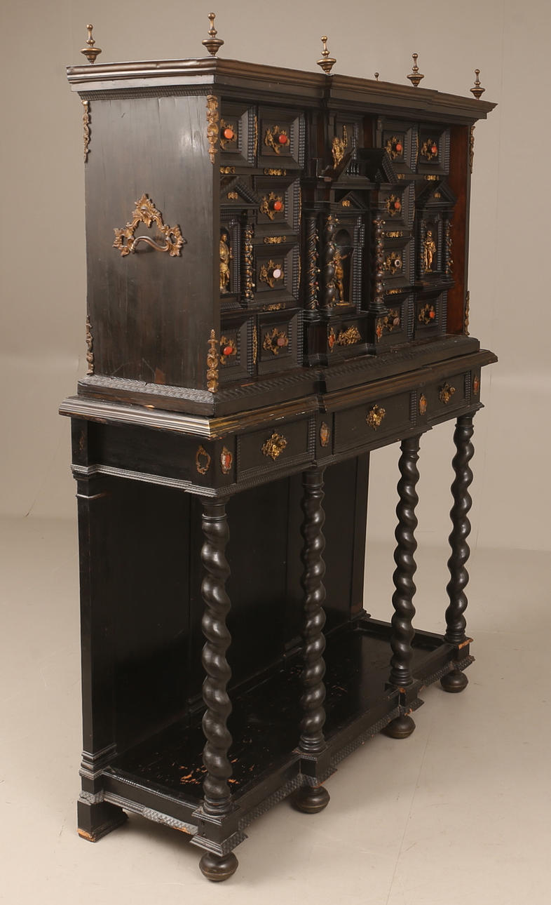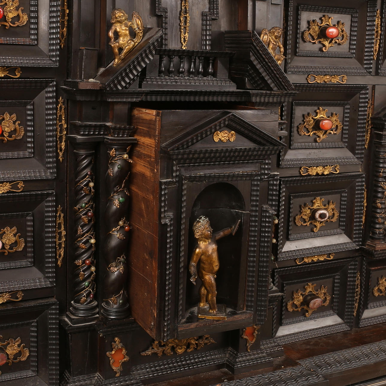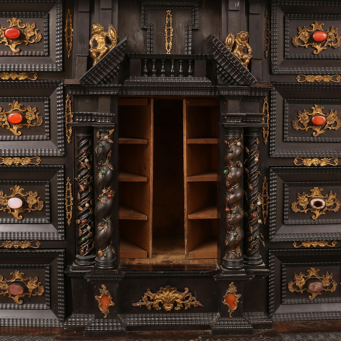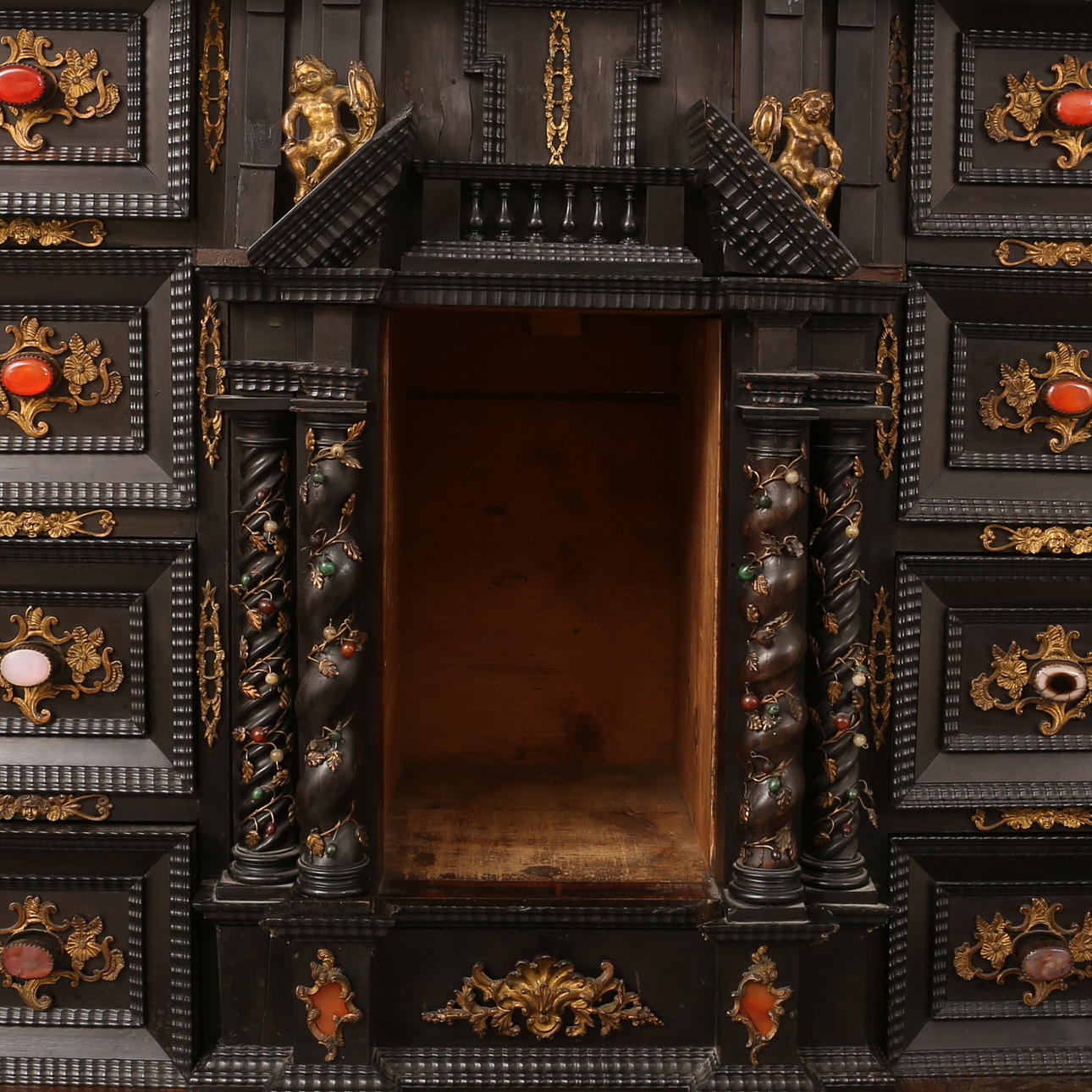 Tablett aus Ahorn. Schrankschränke, furniert mit Ebenholz, Achatsteinen, Knospen, Beinen und vergoldeten Figuren aus Bronze.