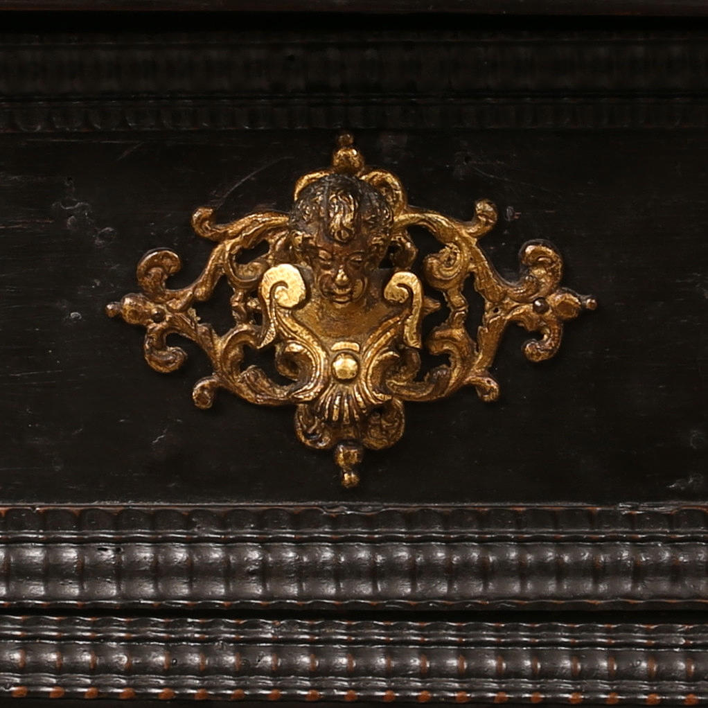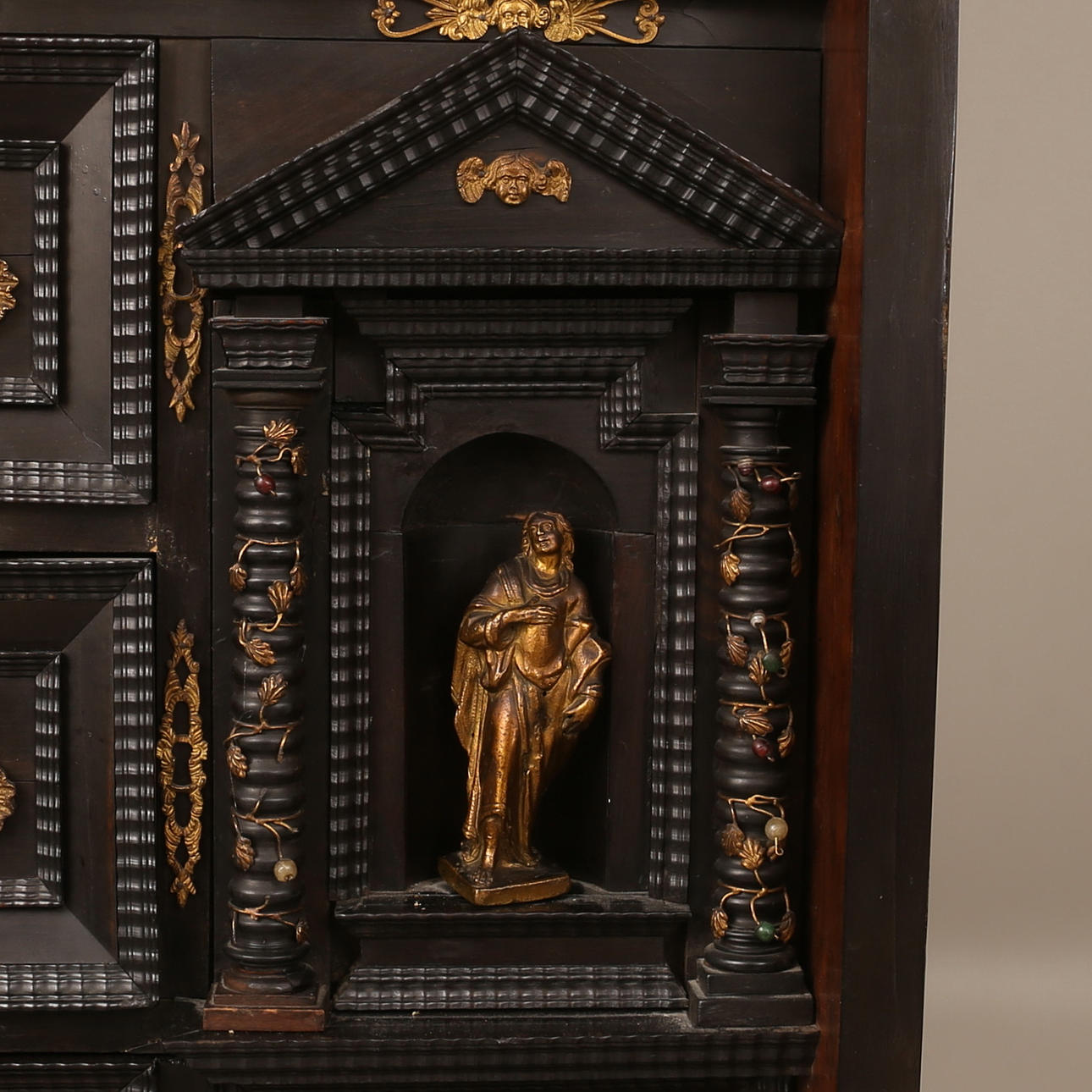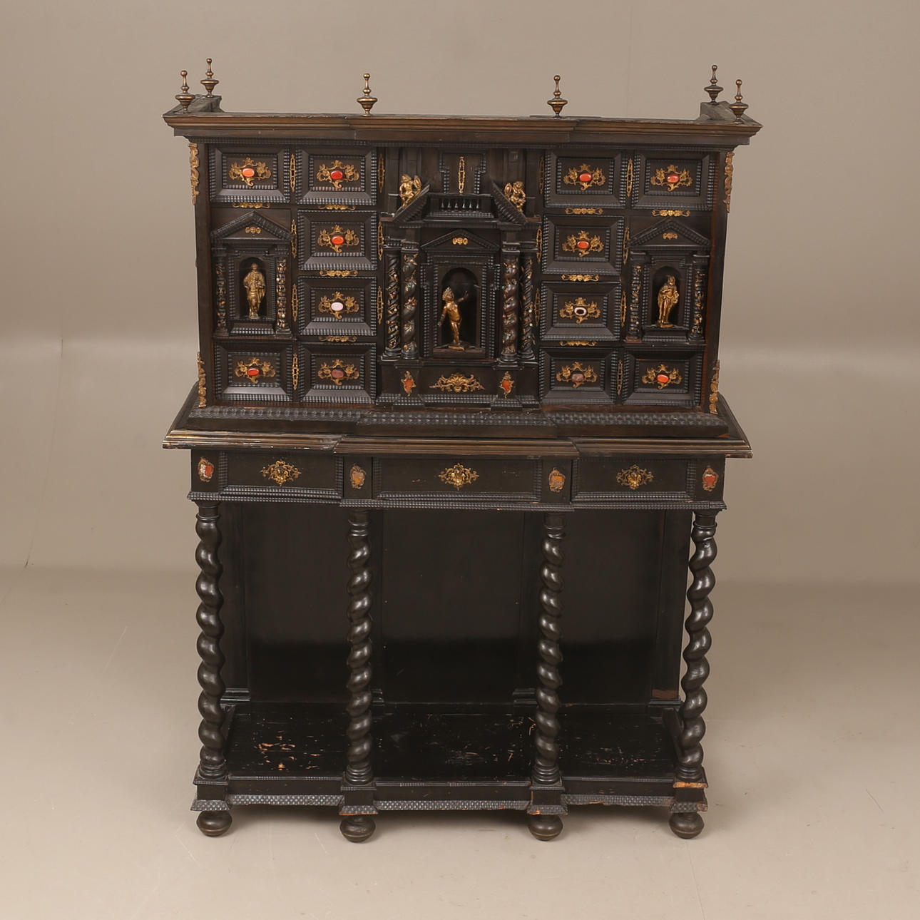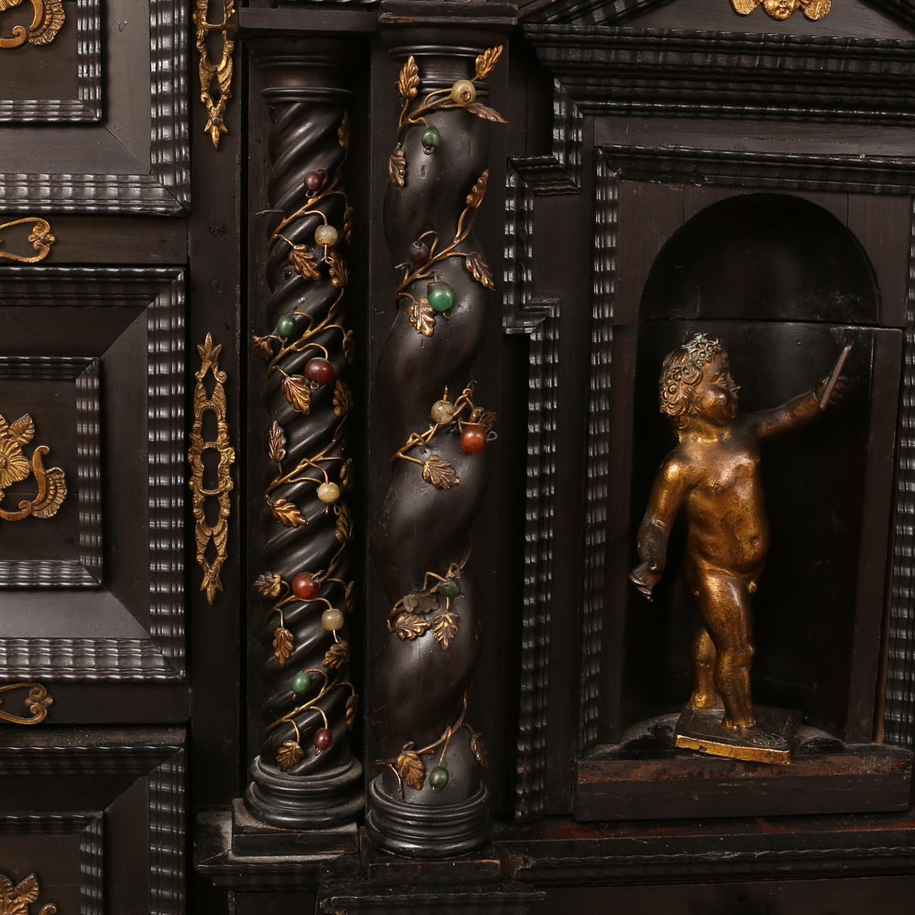 Tablett aus Ahorn. Schrankschränke, furniert mit Ebenholz, Achatsteinen, Knospen, Beinen und vergoldeten Figuren aus Bronze.