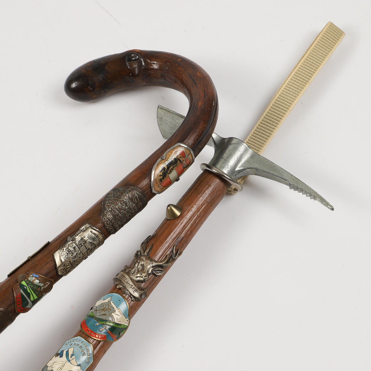 WANDERSTÖCKE UND EISPICKEL, geschnitzte Holzarbeiten mit Plaketten.
