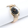 Mauthe-Armbanduhr mit Goldgehäuse auf Stahl, schwarzem Zifferblatt mit Zentralsekunde, arabischen Kardinalziffern. Handaufzugswerk, Gehäuse Ø 33 mm Flexarmband, vergoldet.