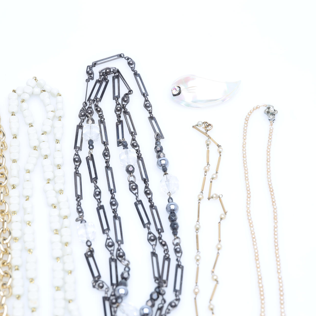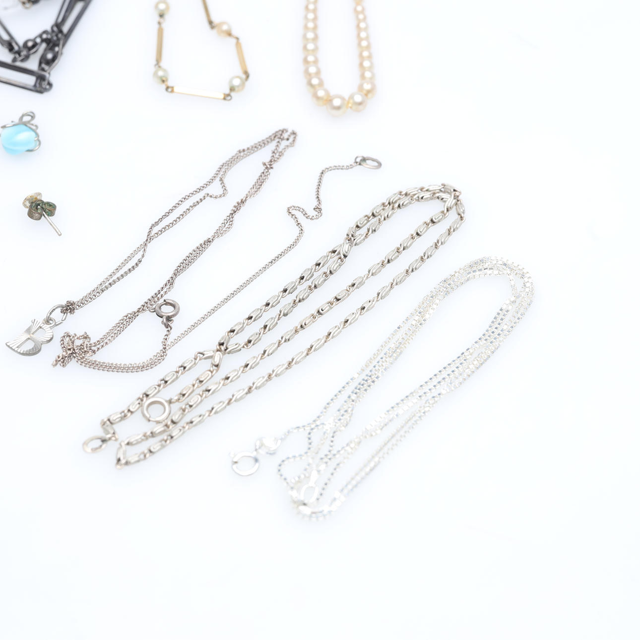 3 Ketten ca. 42 cm, 52 cm, 69 cm 1 Charm Bruttogewicht ca. 10 g Gemischte Schmuckstücke aus Kunststoff und Metall und 3 Damenuhren.