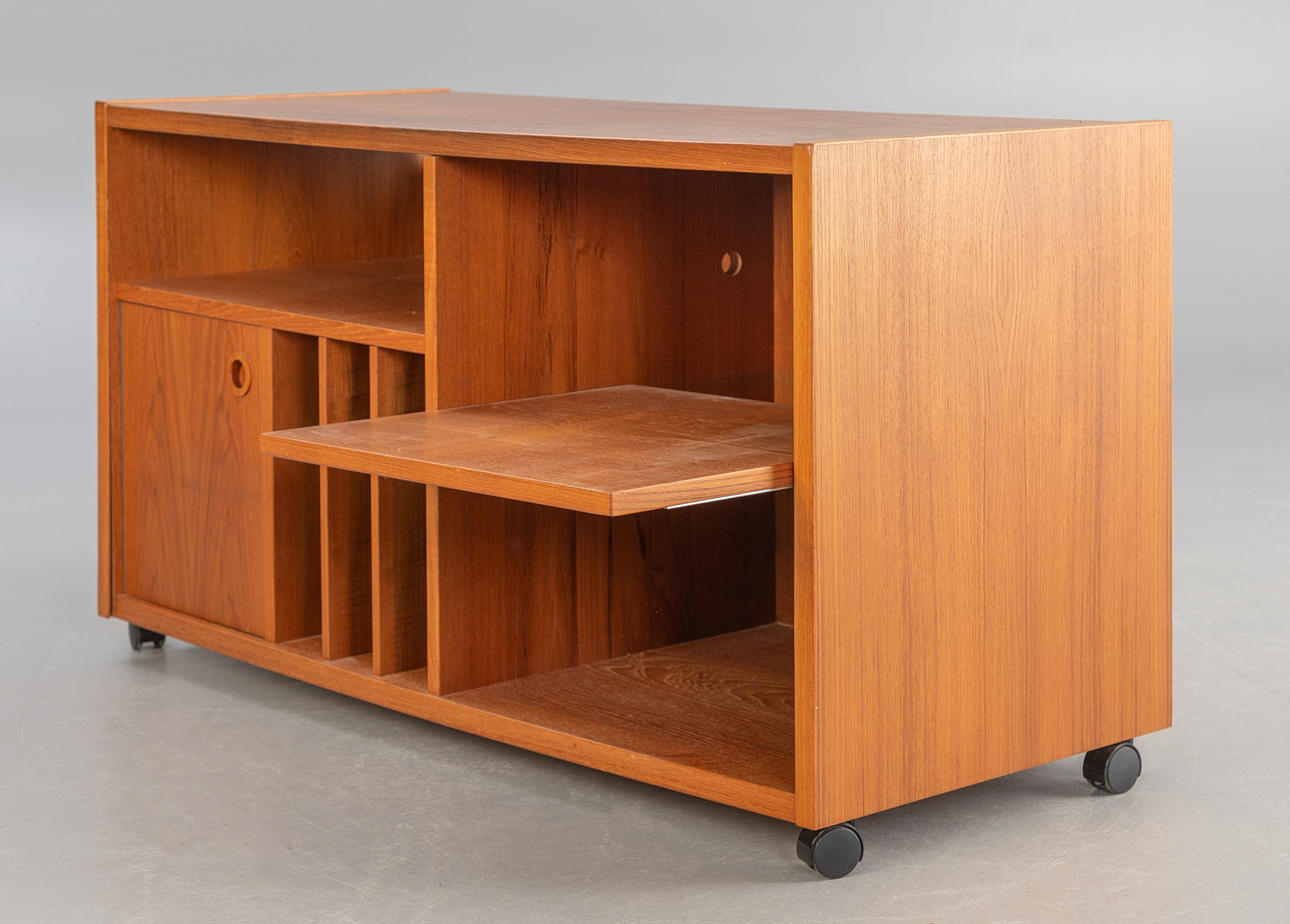 Teak Phono Schrank, Mid Century Design. Konstruktion aus Holz, Teakholzfurniert. Schrank auf Kunststoffrollen, Ein Regalboden zum herauziehen, Schallplattenregale, Löcher in der Rückwand für die Kabelführung.