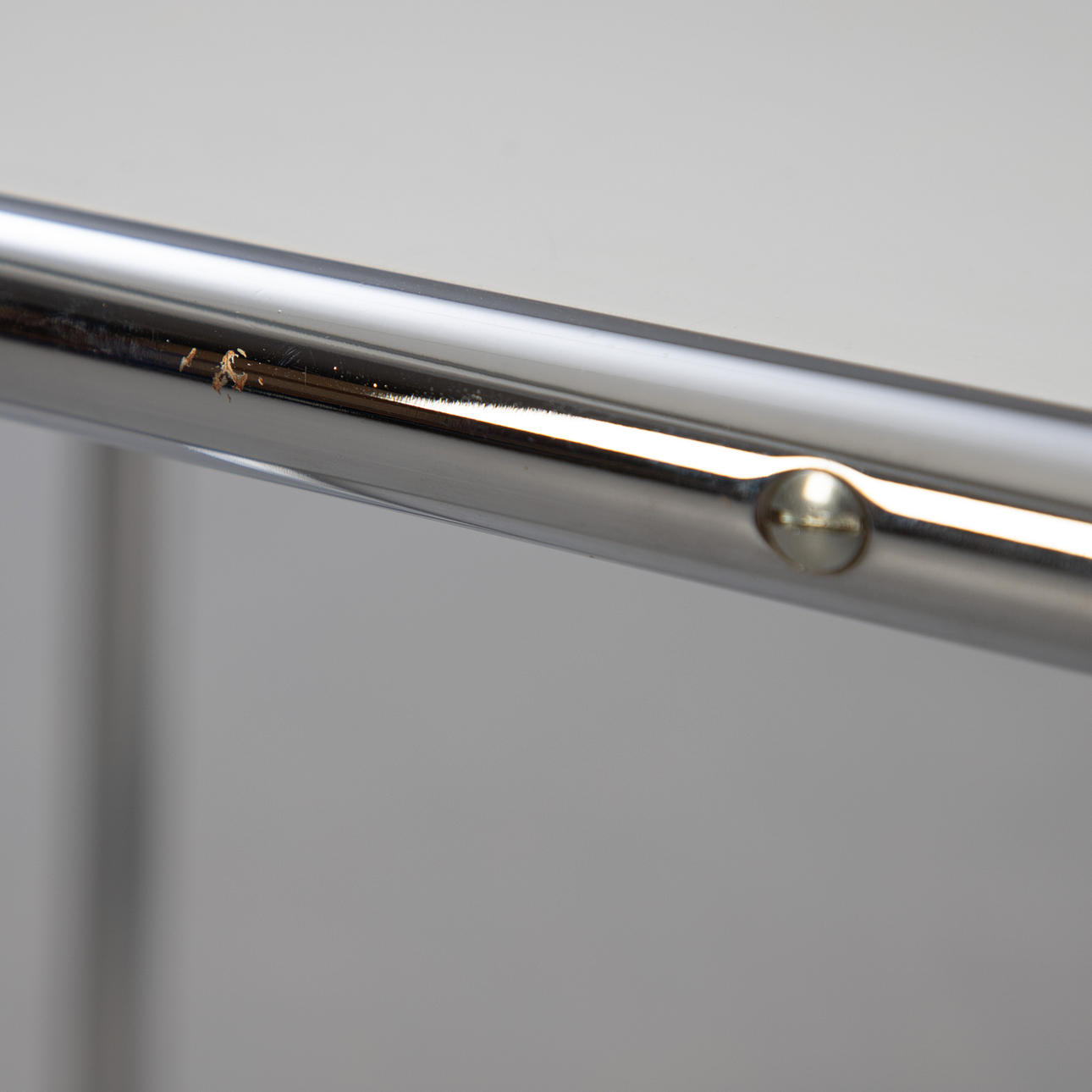 Arnold Bauhaus Collection (L&C Arnold Stendal GmbH), weiß lackierte Holzplatte auf verchromtem Stahlrohrgestell. Mit Herstelleraufkleber bezeichnet.