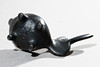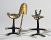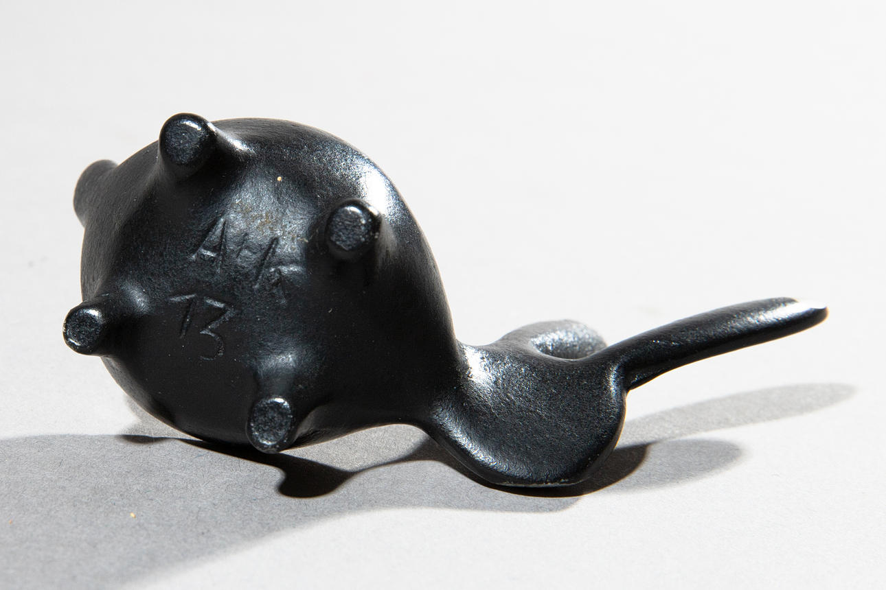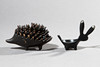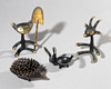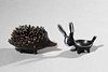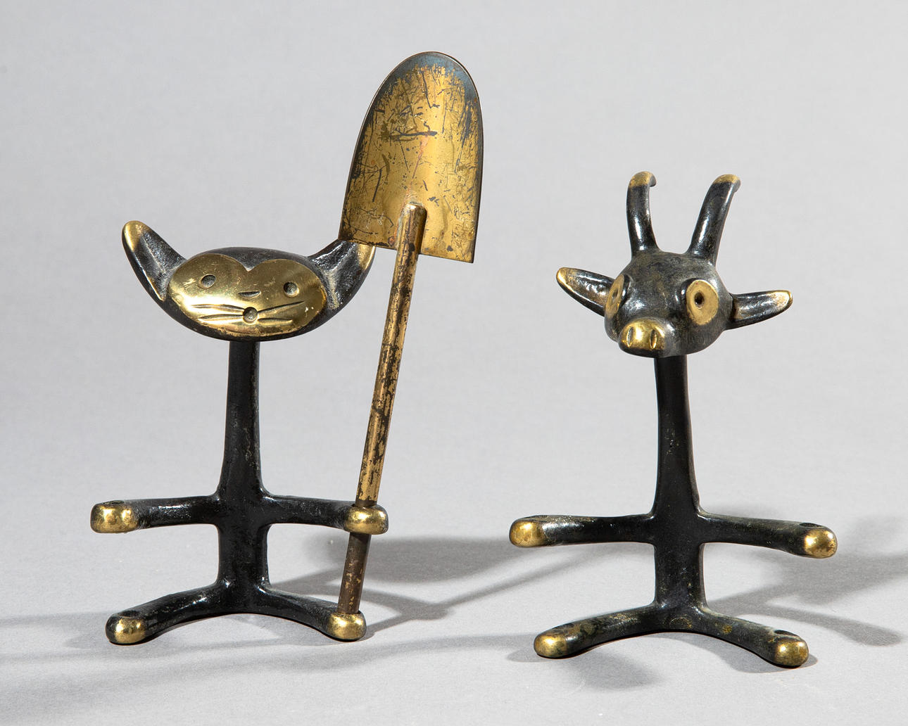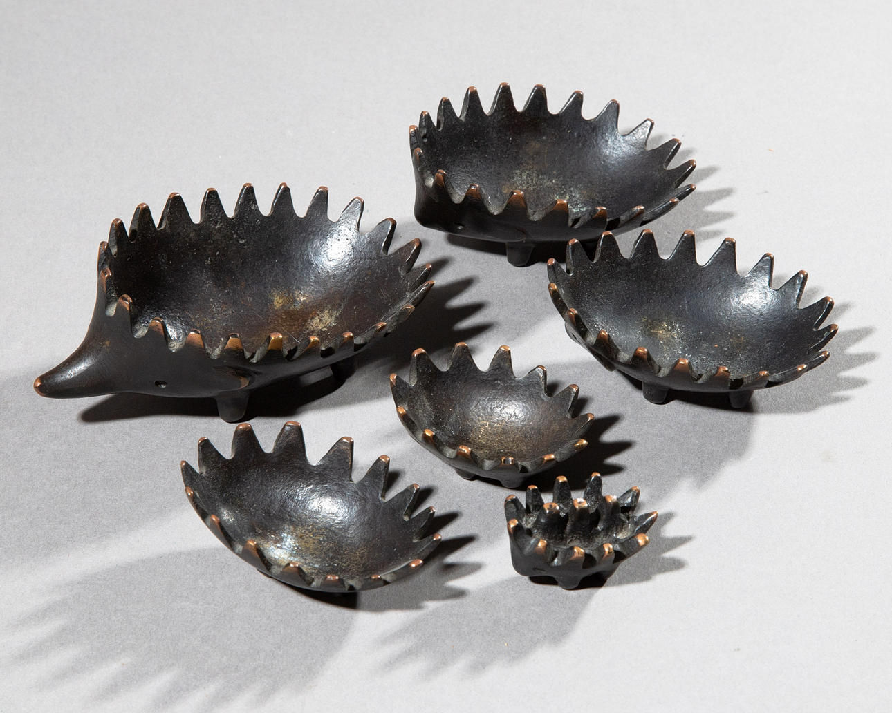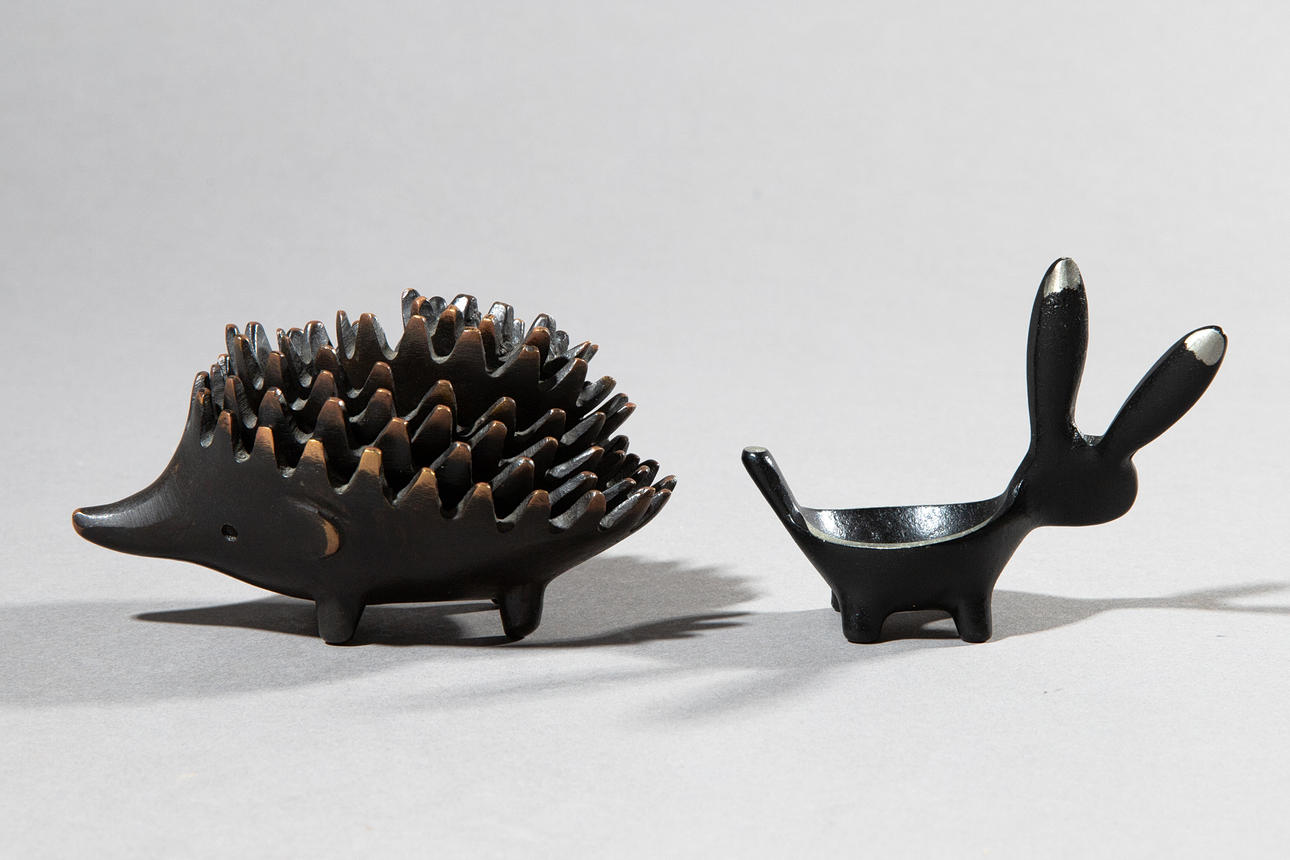4 Figuren. Messing, geschwärzt, teilweise poliert. Igel 6-teilig (6,5 x 7 x 11 cm), Ziege (H. 12,5 cm), Hase (H. 6 cm), Katze (H. 12 cm).