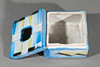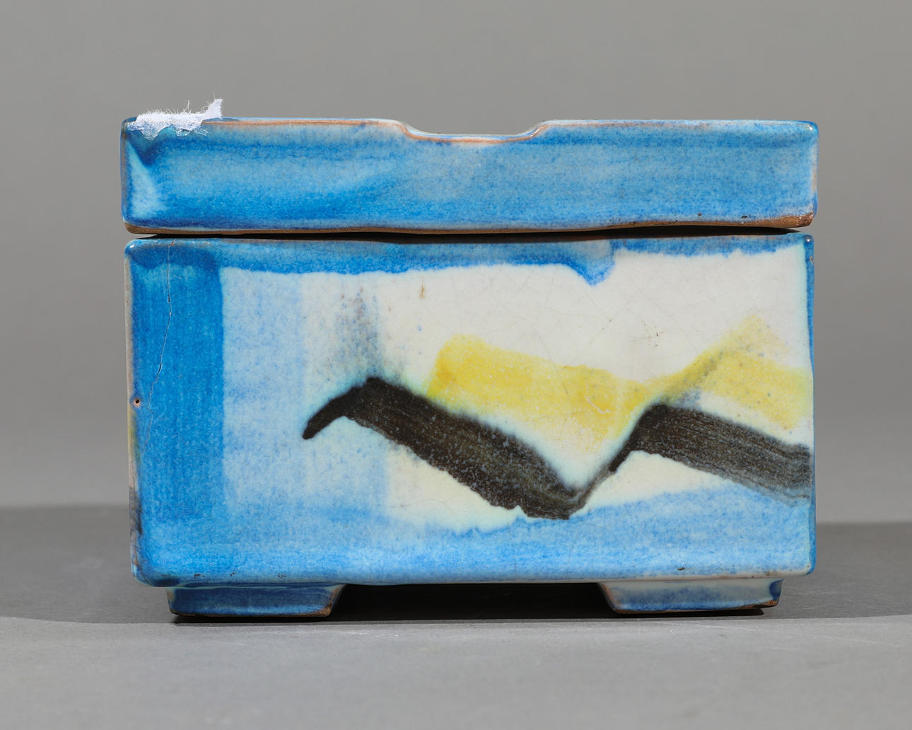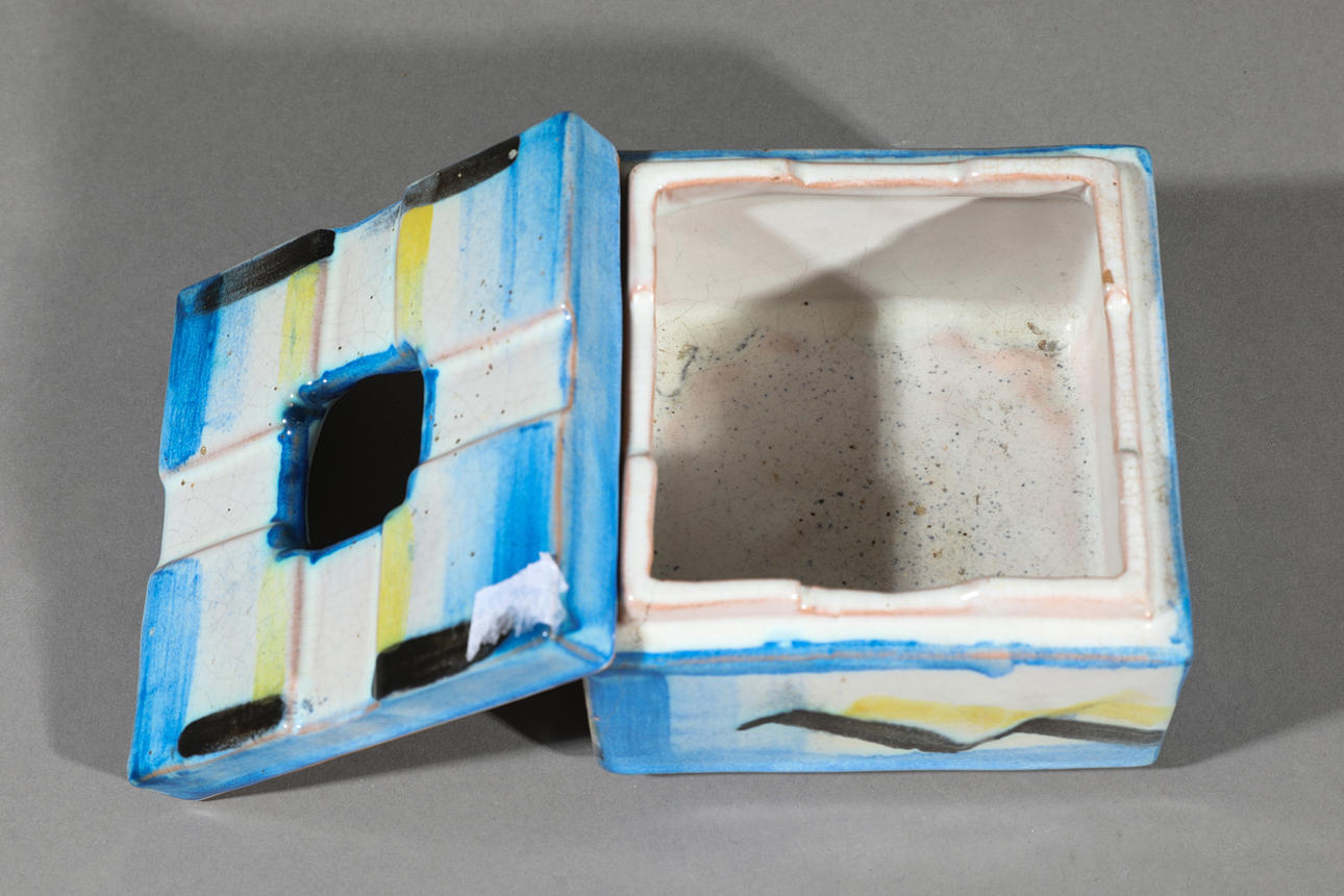 Stövchen. Keramik, polychrome Craquele-Glasur mit geometrischem Art Deco Dekor. 8 x 11 x 11 cm. Am Boden mit Werkstattmarke bezeichnet.