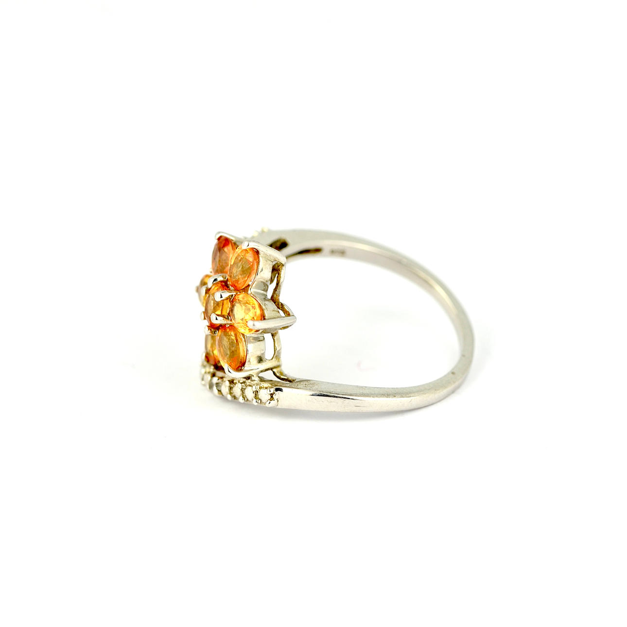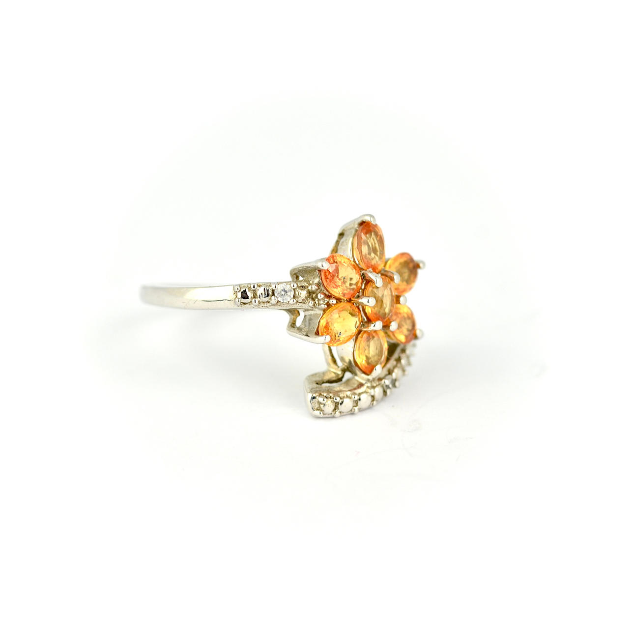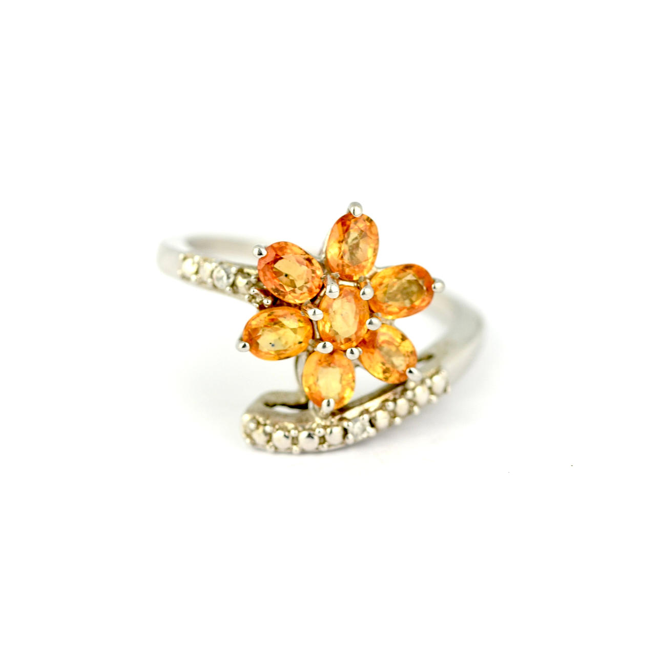 Ein Wickelring aus 925er Silber, besetzt mit oval geschliffenen Citrinen in Form einer Blume, Ringgröße R.