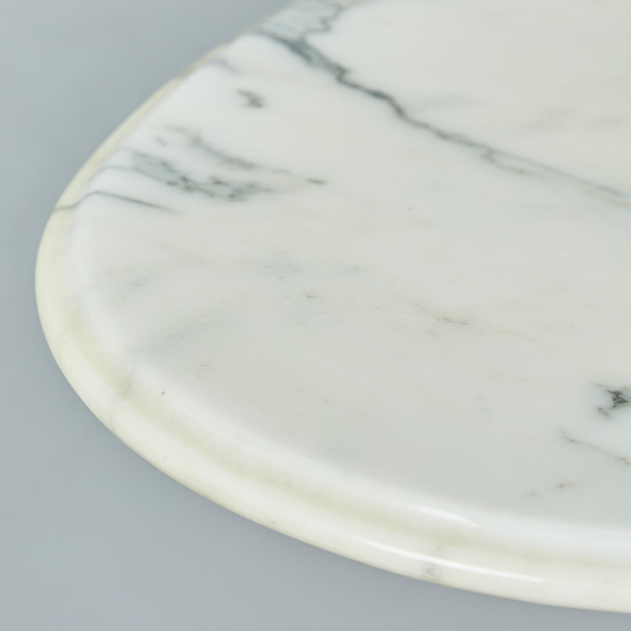 Bistrotisch / Tisch, Marmor, Gusseisen. Bistrotisch mit einem Dreisternfuß und Stand aus schwarz lackiertem Gusseisen, mit einer ovalen Tischplatte aus cremefarbenem Marmor mit schwarzer Äderung, unterseitig fest montiert, H.70cm, L.75cm, B.55cm.