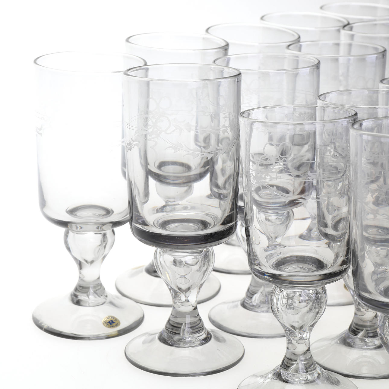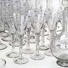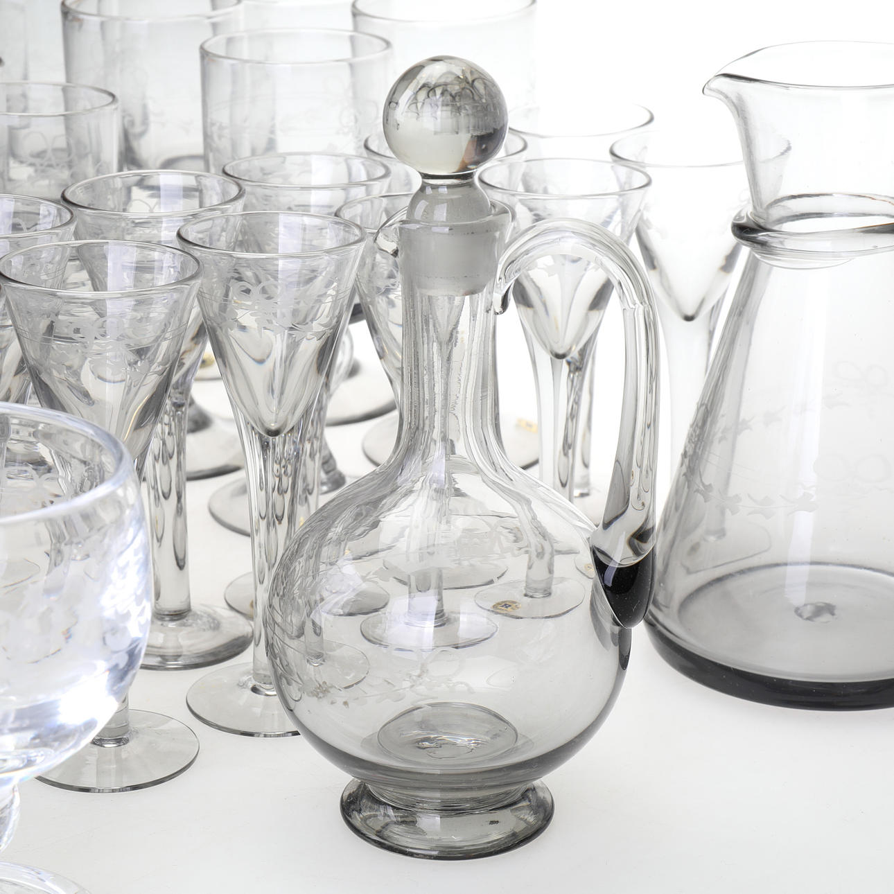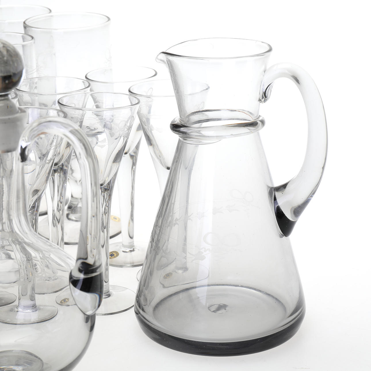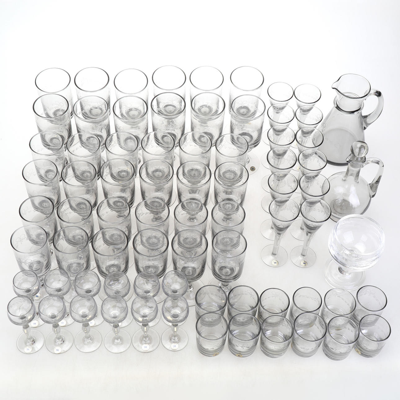 Rauchgetönt 12 Gläser, ca. ø 7 cm, 18 cm hoch 12 Gläser, ca. ø 6,5 cm, 16,5 cm hoch 12 Gläser, ca. ø 6 cm, 15 cm hoch 12 Gläser, ca. ø 5,5 cm, 15 cm hoch 12 Gläser, ca. ø 5,5 cm, 6 cm hoch 12 Gläser, ca. ø 4 cm, 11,5 cm hoch 1 Kanne 1 Karaffe Klarglas 1 Schüssel auf Fuß ca. ø 9 cm, 14 cm hoch.
