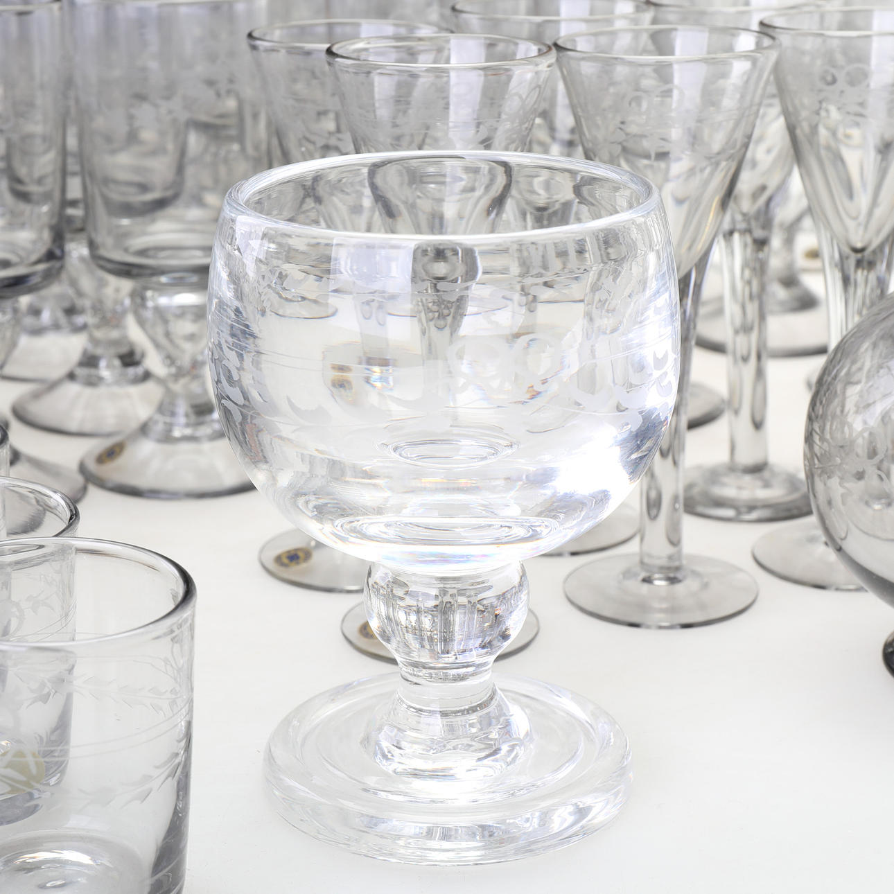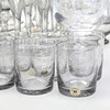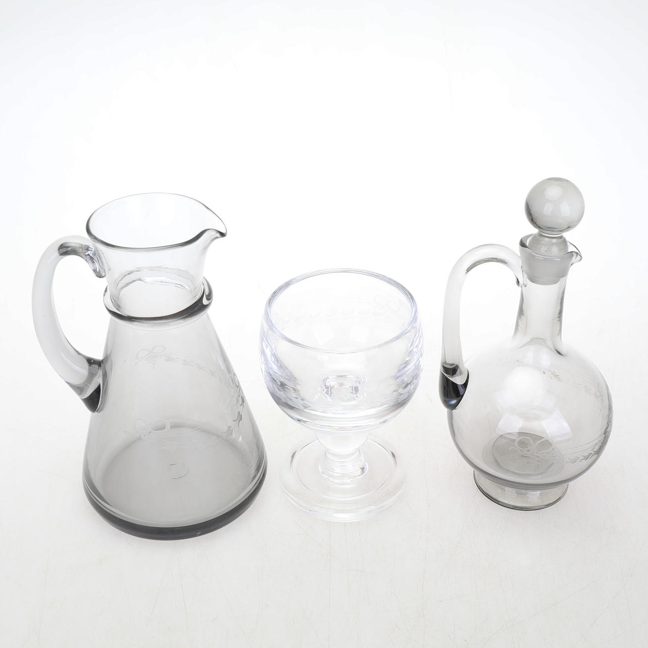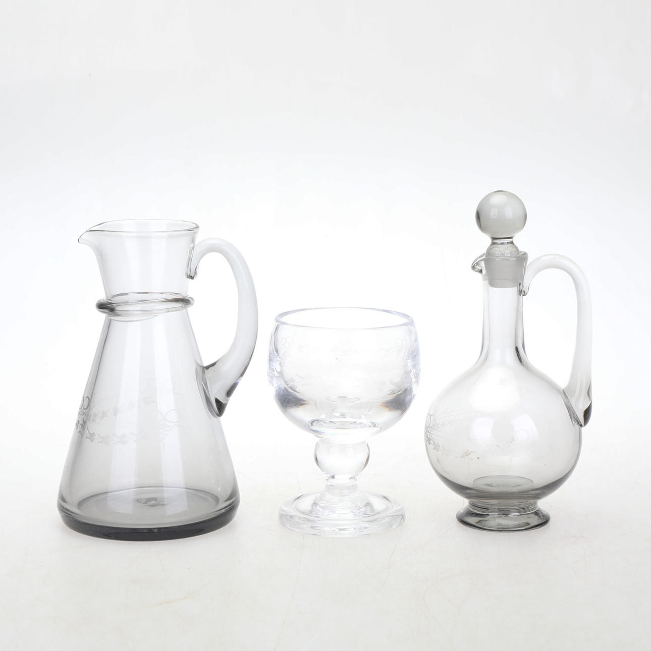 Rauchgetönt 12 Gläser, ca. ø 7 cm, 18 cm hoch 12 Gläser, ca. ø 6,5 cm, 16,5 cm hoch 12 Gläser, ca. ø 6 cm, 15 cm hoch 12 Gläser, ca. ø 5,5 cm, 15 cm hoch 12 Gläser, ca. ø 5,5 cm, 6 cm hoch 12 Gläser, ca. ø 4 cm, 11,5 cm hoch 1 Kanne 1 Karaffe Klarglas 1 Schüssel auf Fuß ca. ø 9 cm, 14 cm hoch.