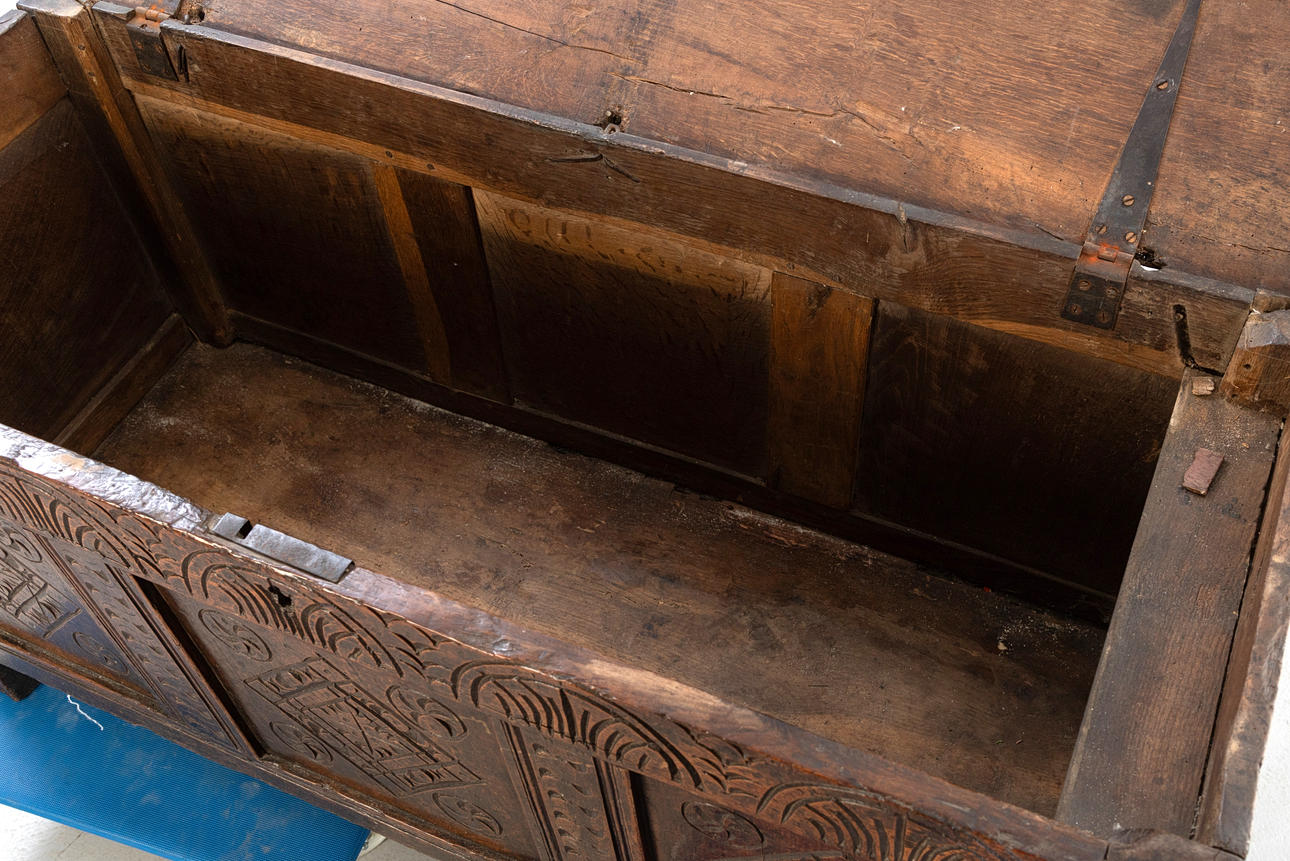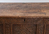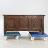 Eiche, dunkelbraun gebeizt, variierende Schnittdekore. Rechteckiger Korpus mit Flachdeckel auf Stollen. Vierseitige vertiefte Füllungen, darin frontseitig zentrale Rauten, von Rosetten begleitet. Stilisierte Flechtbänder auf den Stollen und den Streben. HxBxT: ca. 62 x 131 x 50 cm.
