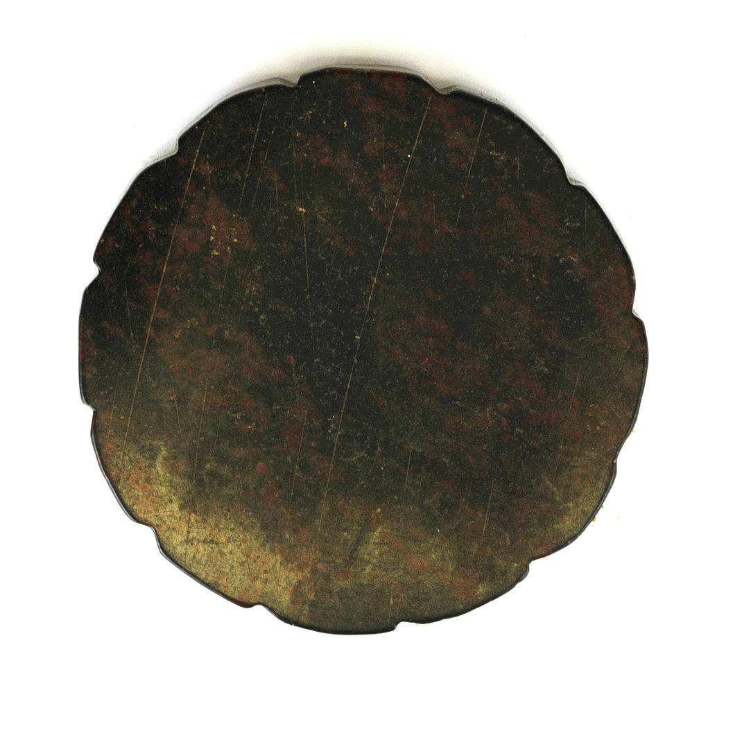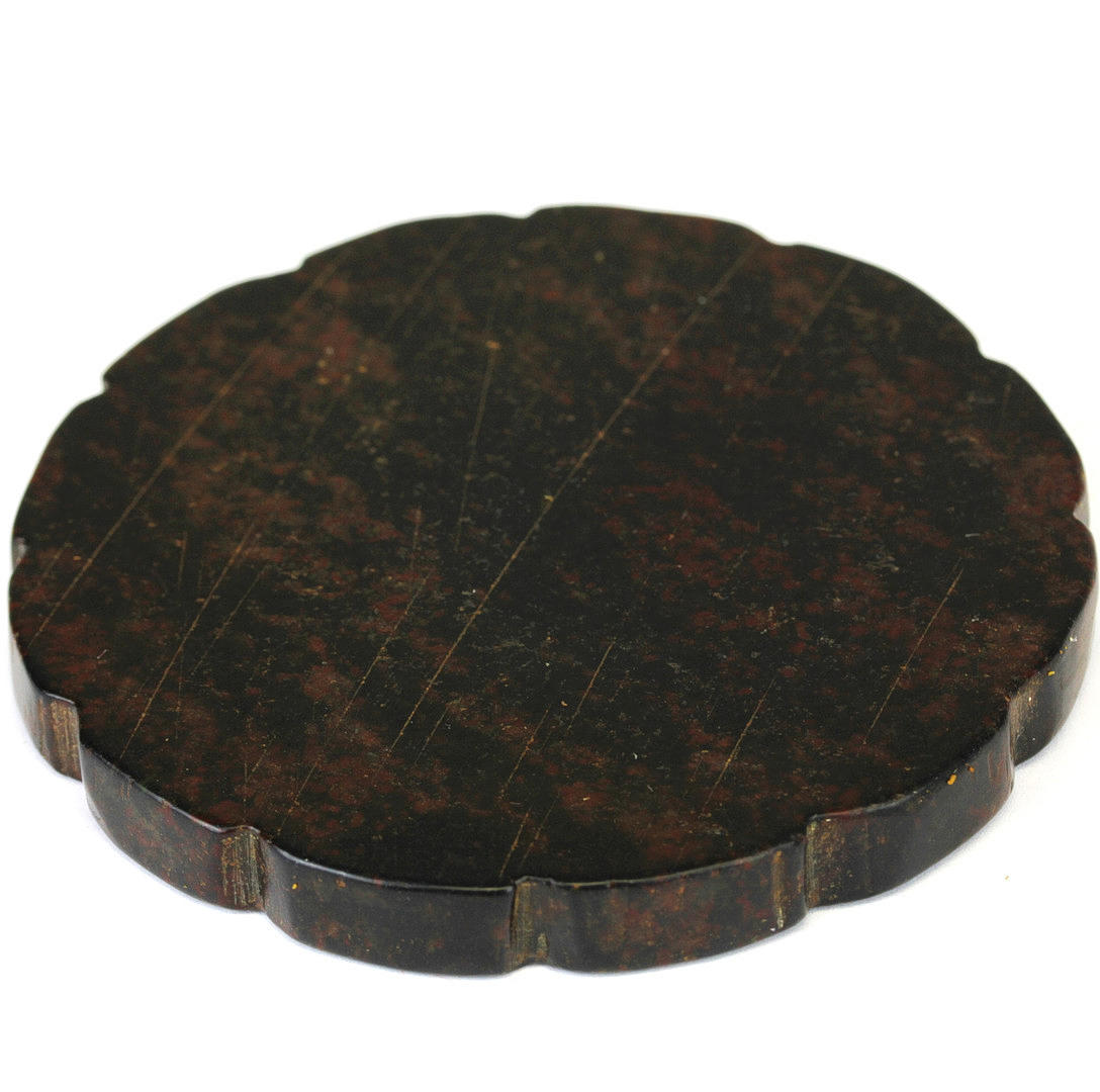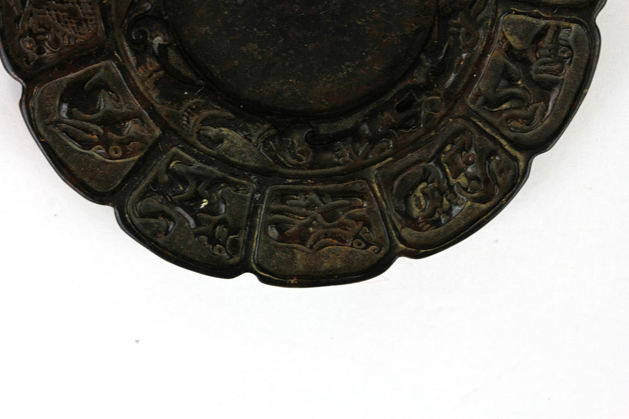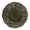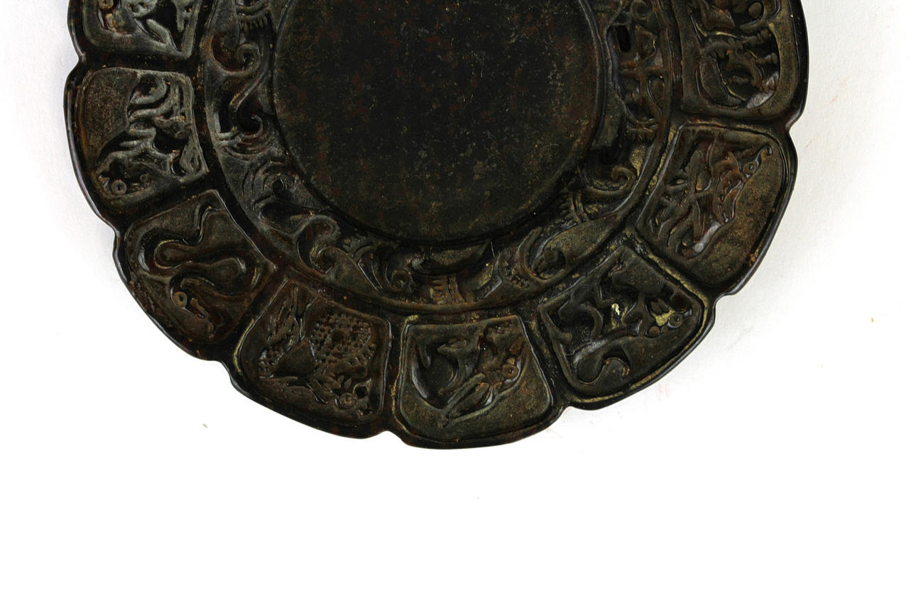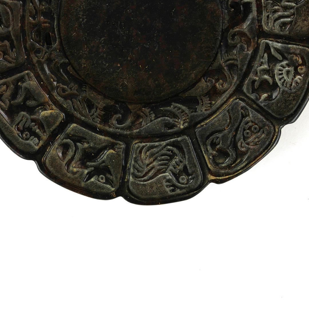 Ein chinesischer geschnitzter brauner Jade-/Hartstein-Tintenschleifstein, verziert mit den Zwölfjahreszeichen, Dia. 8cm.