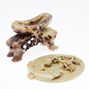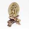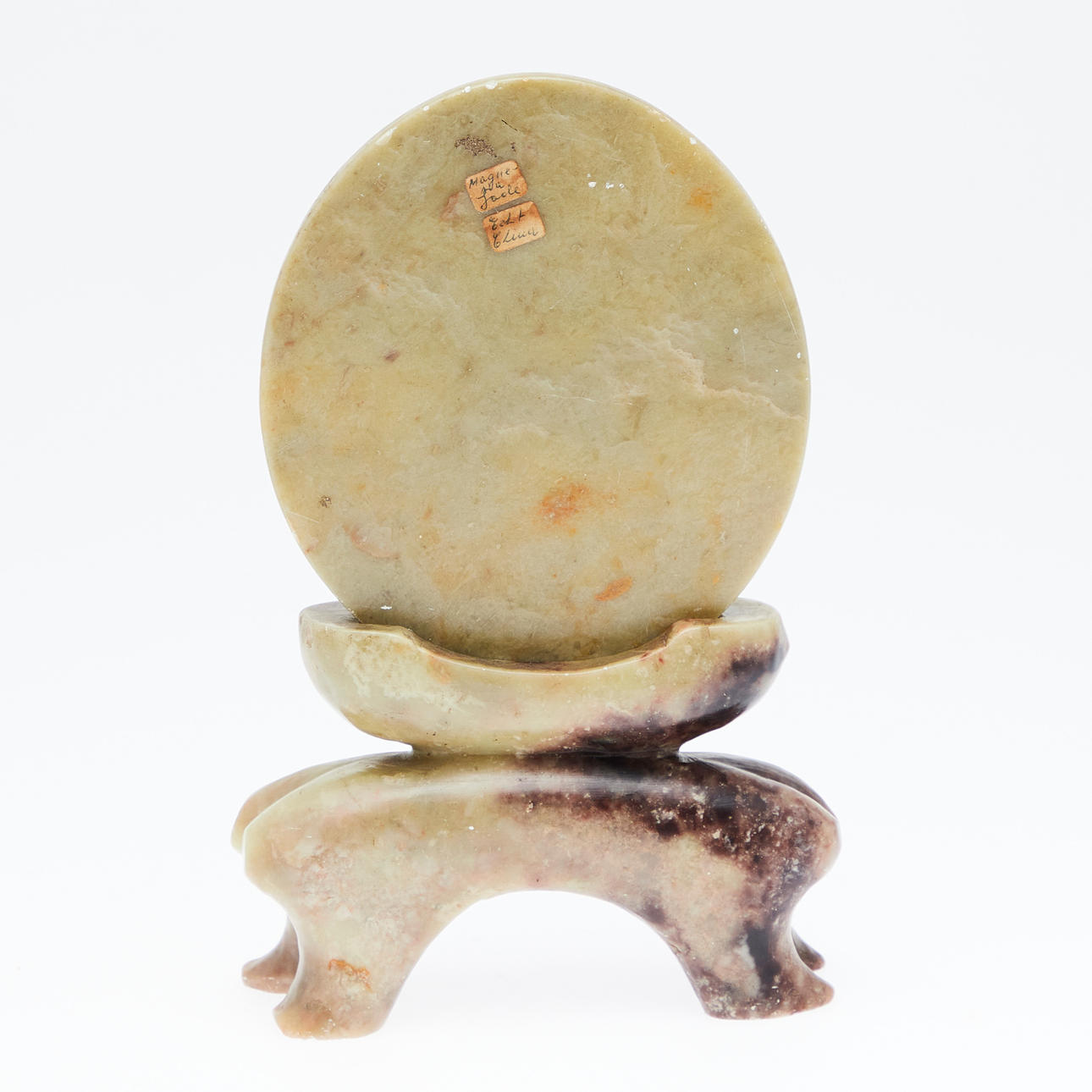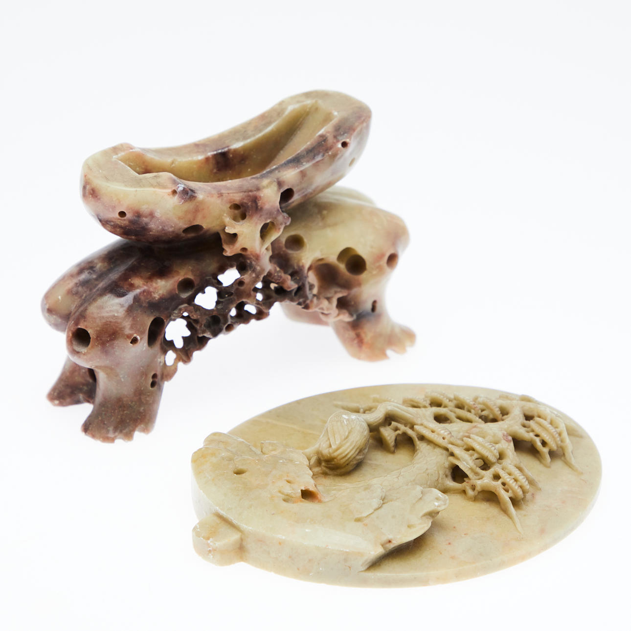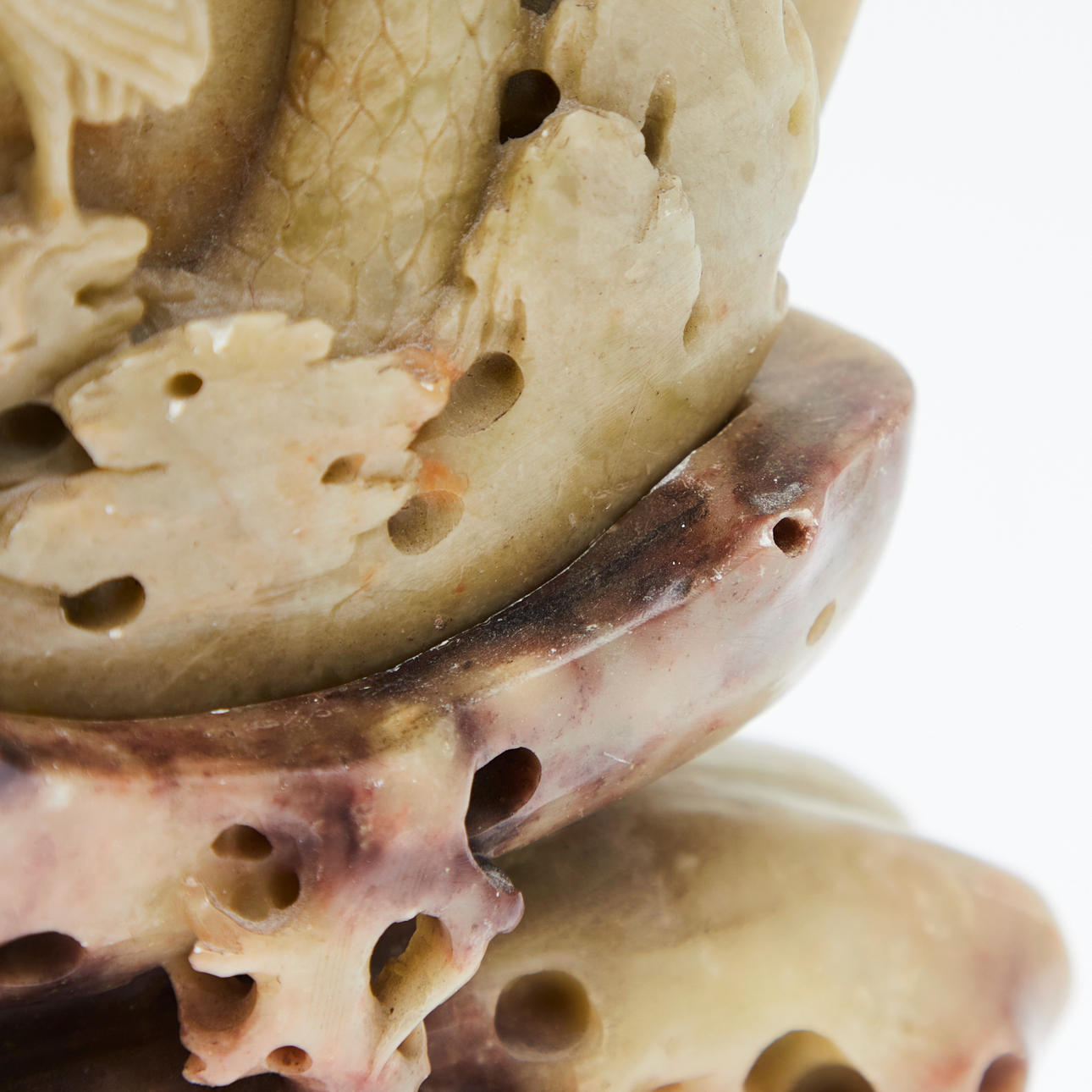 Skulptur / Figur, Kranich am Baum, Speckstein, China. Zweiteilige Figur aus grün-rotem Speckstein mit einem Sockelbau mit vier Füßen und einem eierförmigen Relief mit der Darstellung eines Kranichs neben einem Baum stehend, lose zusammengesteckt, H.23cm, L.14cm, B.5cm.