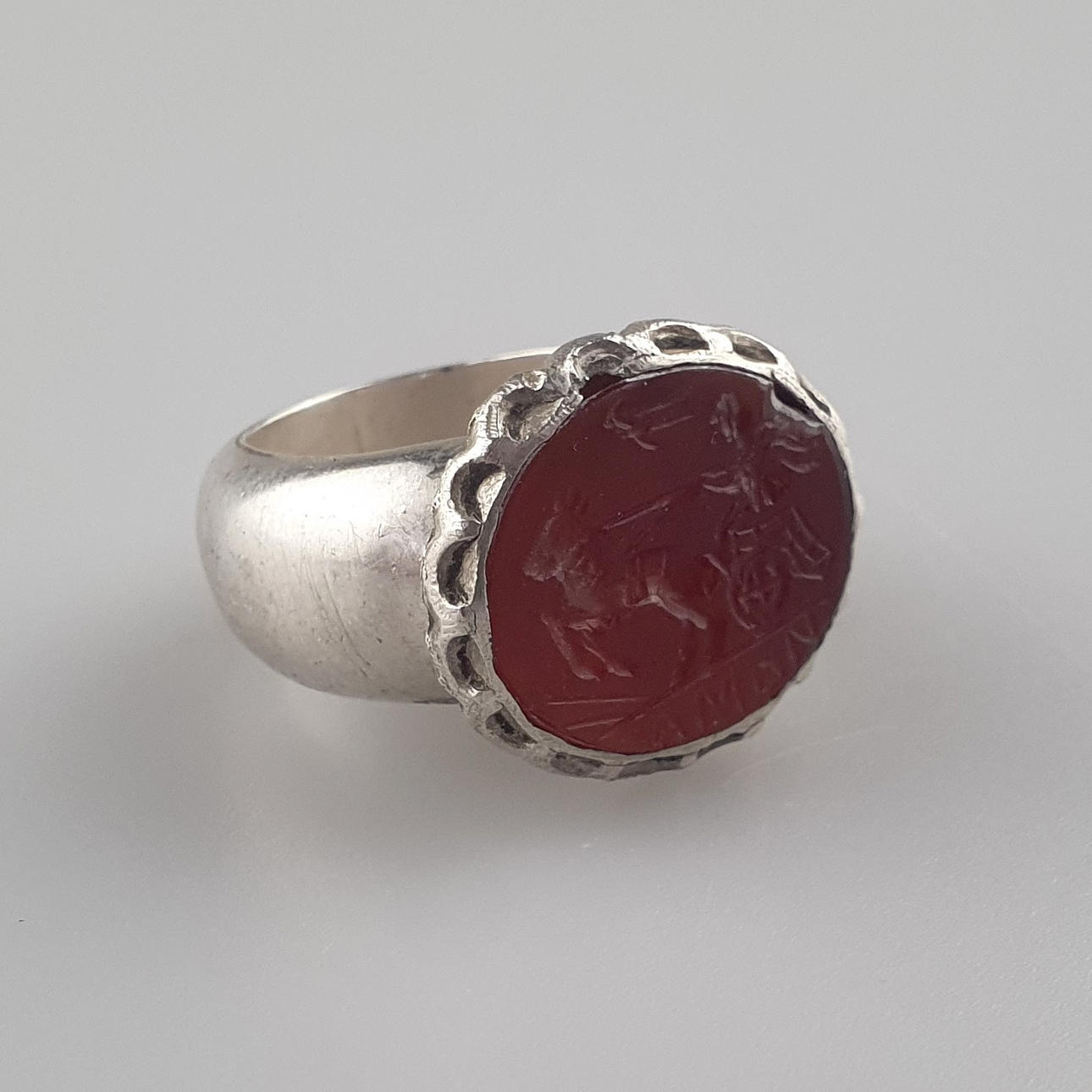 als Ringkopf ovale Karneolplakette, darin die gravierte Abbildung eines Wagenlenkers, unterhalb bezeichnet „AMON“, wohl antik, Fassung später, Ringkopf ca.18 x 11 mm, Dm. Ringschiene ca. 18,5 mm, ca.10,1 g.