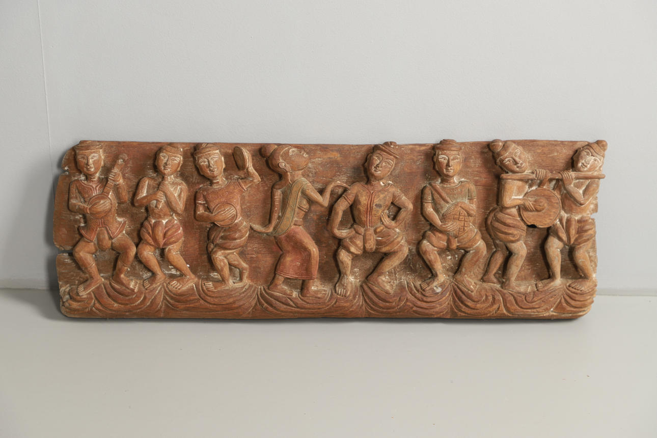 EIN INDISCHER GESCHNITZTER HOLZFRIES MIT ACHT MUSIKER.