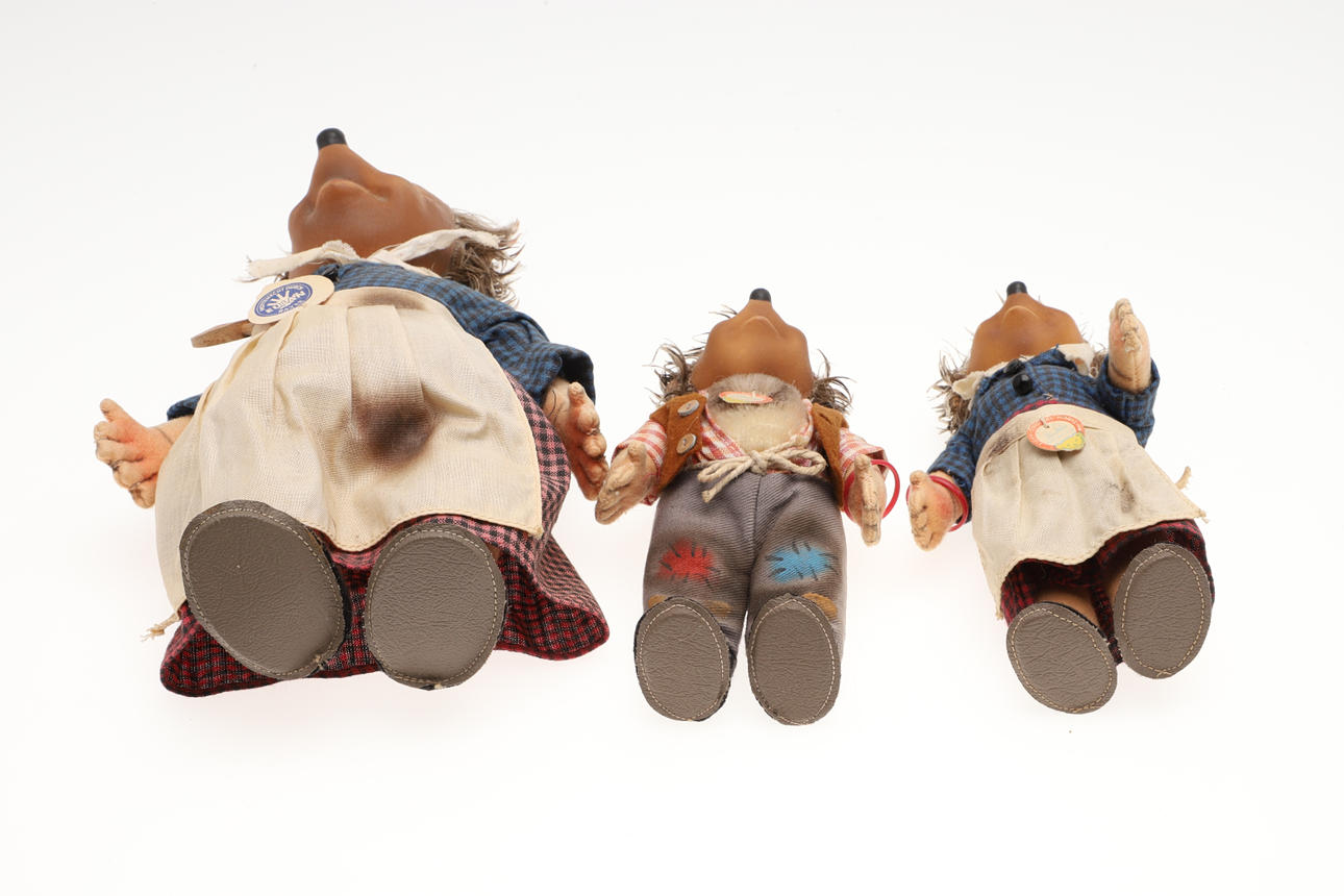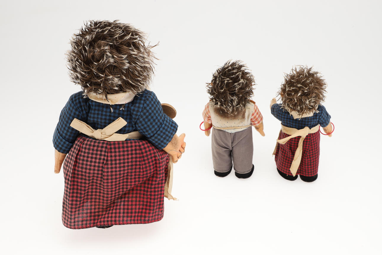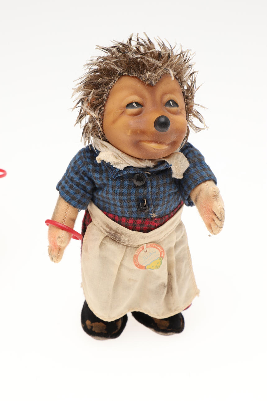Sechs verschiedene Steiff-Igelfiguren, darunter Micki, Macki, Mucki usw., fünf davon mit angebrachten Etiketten. Größte 26 cm hoch. (6).