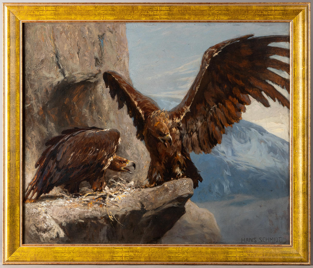 Hans Schmidt (1877-1958), Adlerhorst, Öl auf Malkarton, signiert, ca. 52 x 62 cm, mit Rahmen ca. 61 x 71 cm.