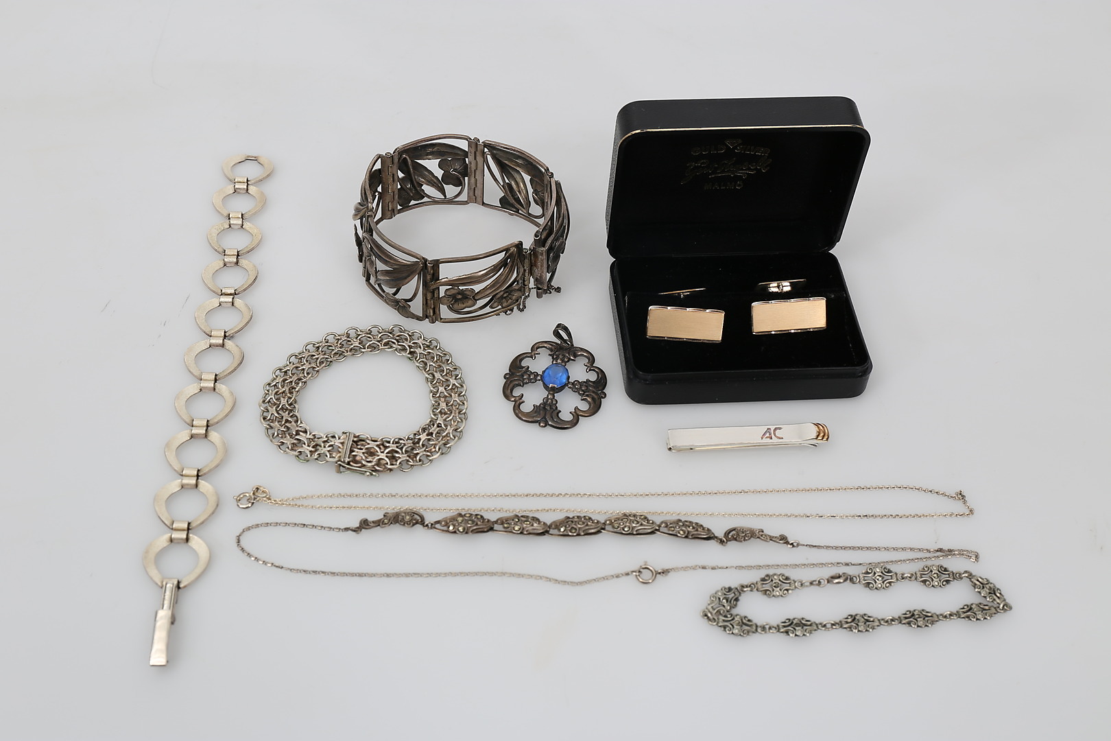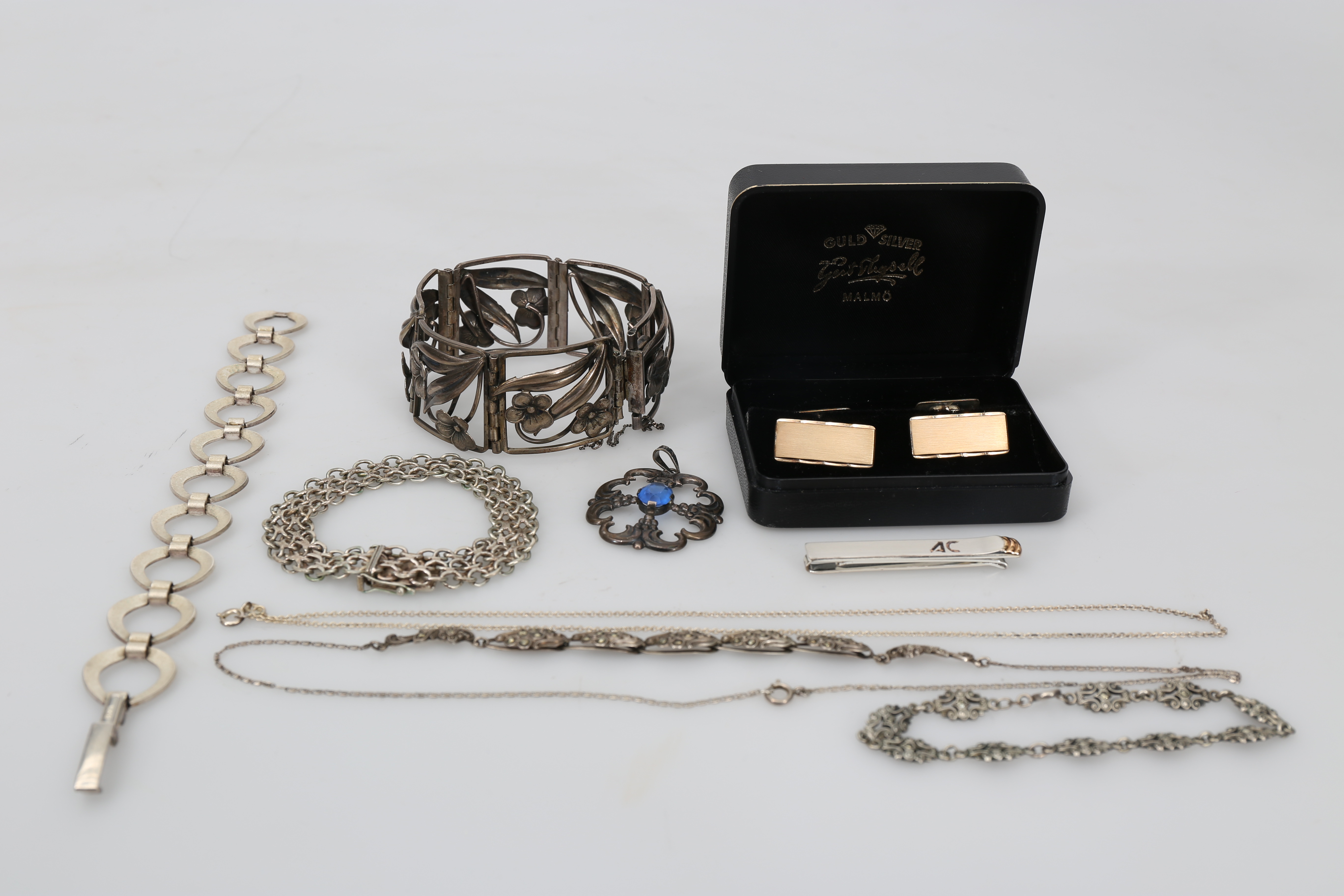 304434. SCHMUCK, Silber, Markasiten und Steine, 129,3 Gramm.