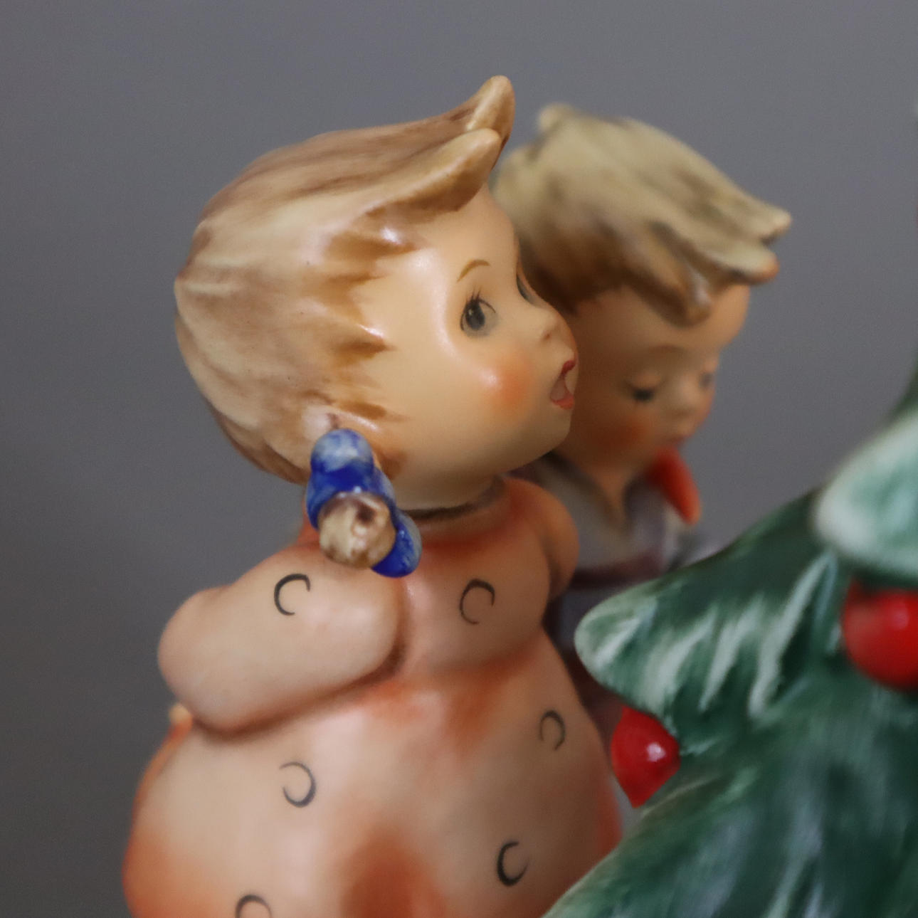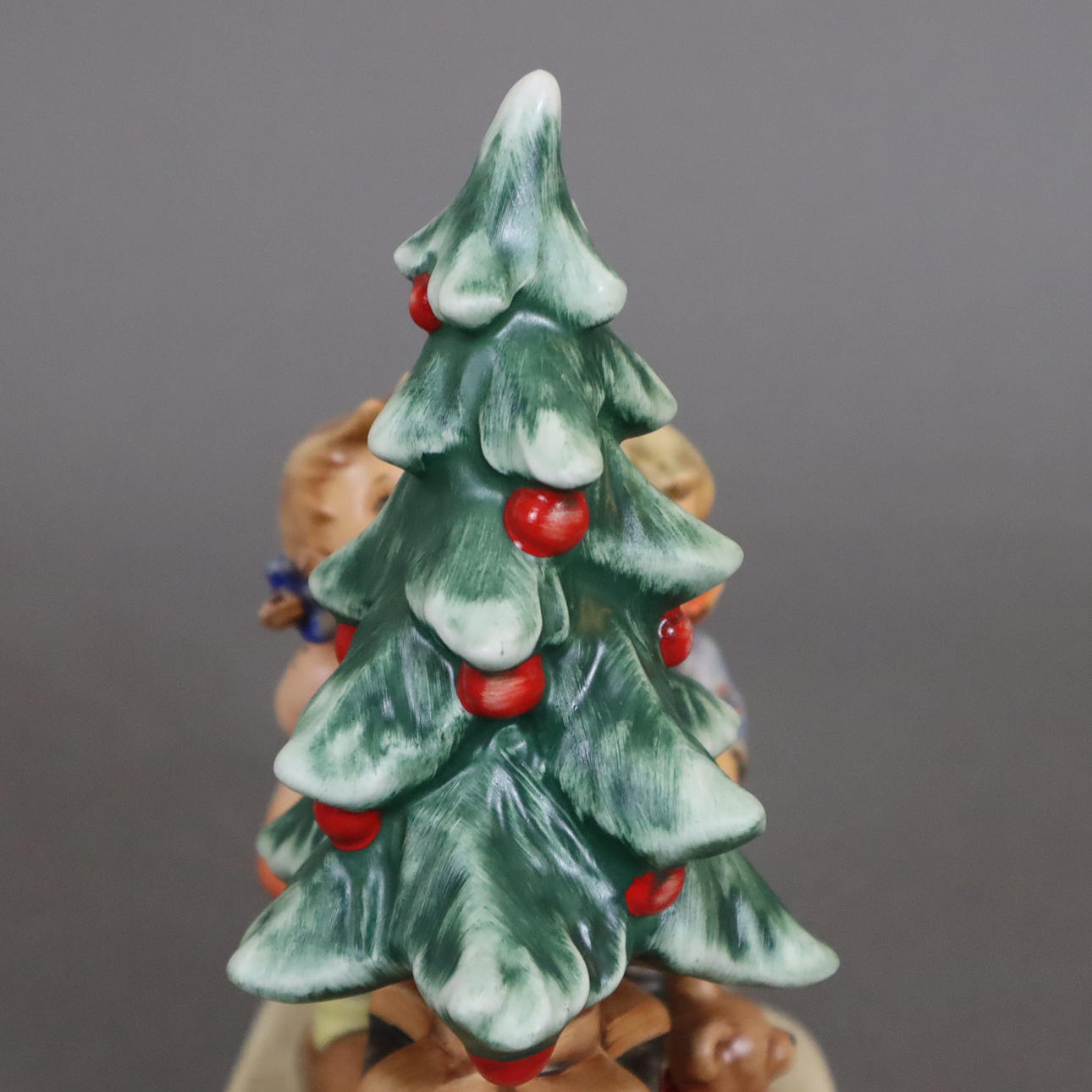Keramik, polychrom bemalt, Kinderpaar mit Weihnachtsbaum und Geschenken, am Sockel Pressignatur "M.J.Hummel", Modellnr. 2015 "Am Weihnachtsbaum/ Wonder of Christmas", Boden mit Manufakturmarke, Malerzeichen und Stempel "Erste Ausgabe 1998", HxL:ca.18x15cm.
