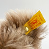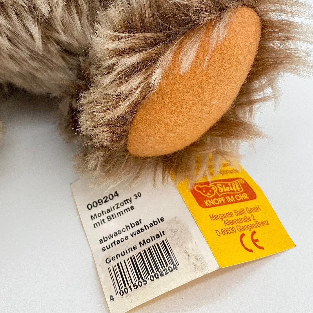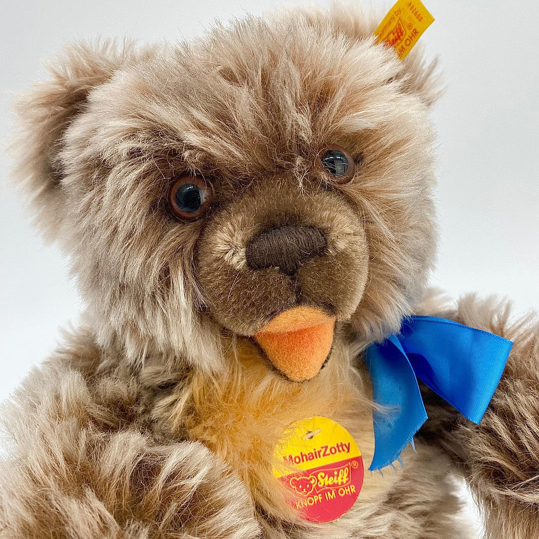 Steiff Teddy Mohair Zotty mit bräunlichem Fell mit orangefarbenen Latz, offenen Maul, dunklen Glasaugen und handgestrickte Nase. Eine blaue Taftschleife ist um den Hals gebunden. Mit Etikett, Knopf und Fahne. Arme und Beine sind beweglich.