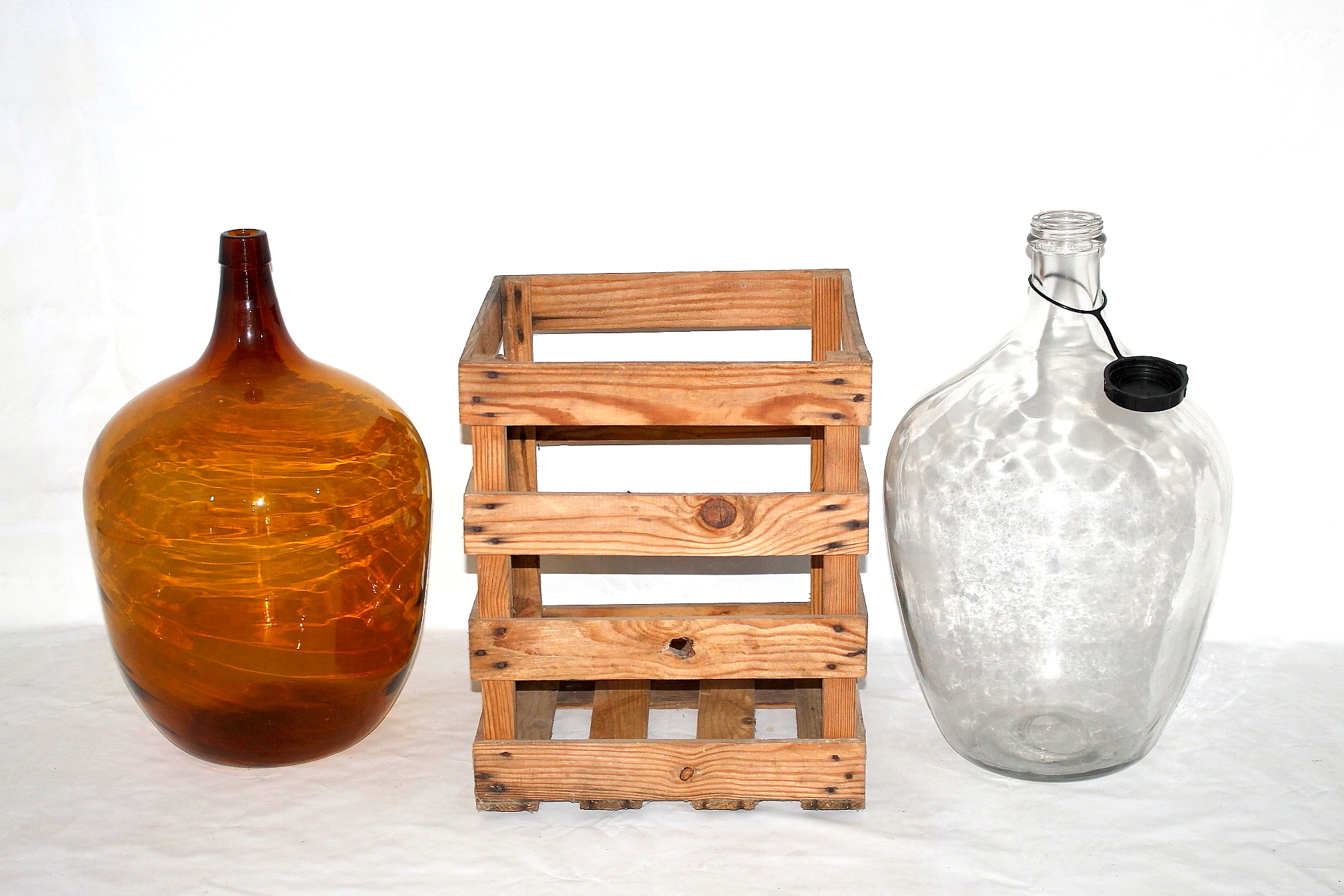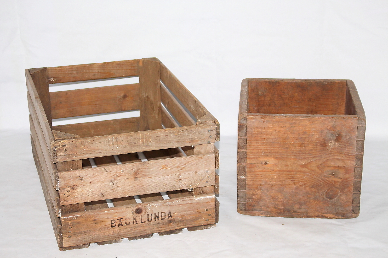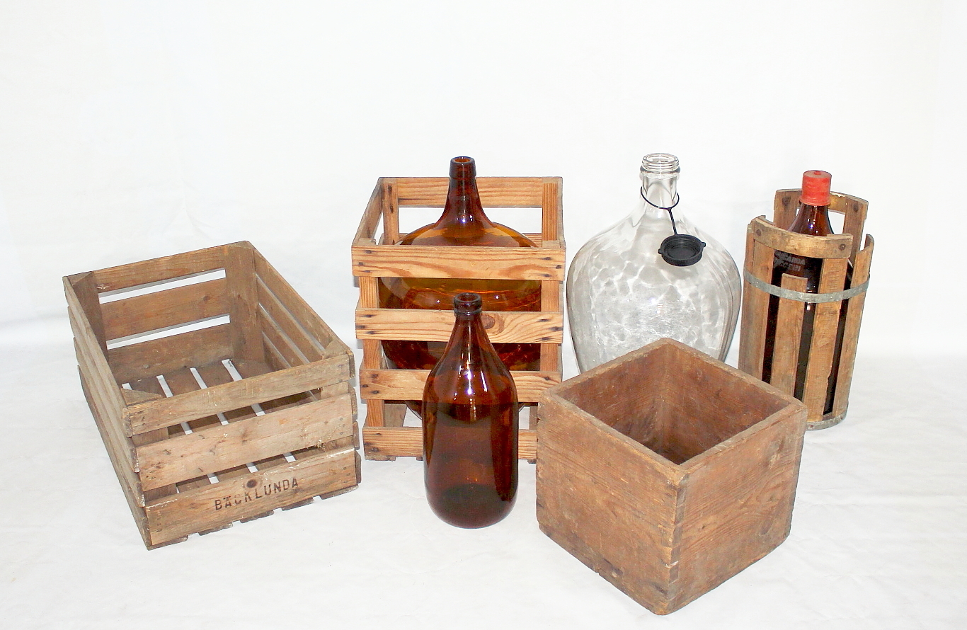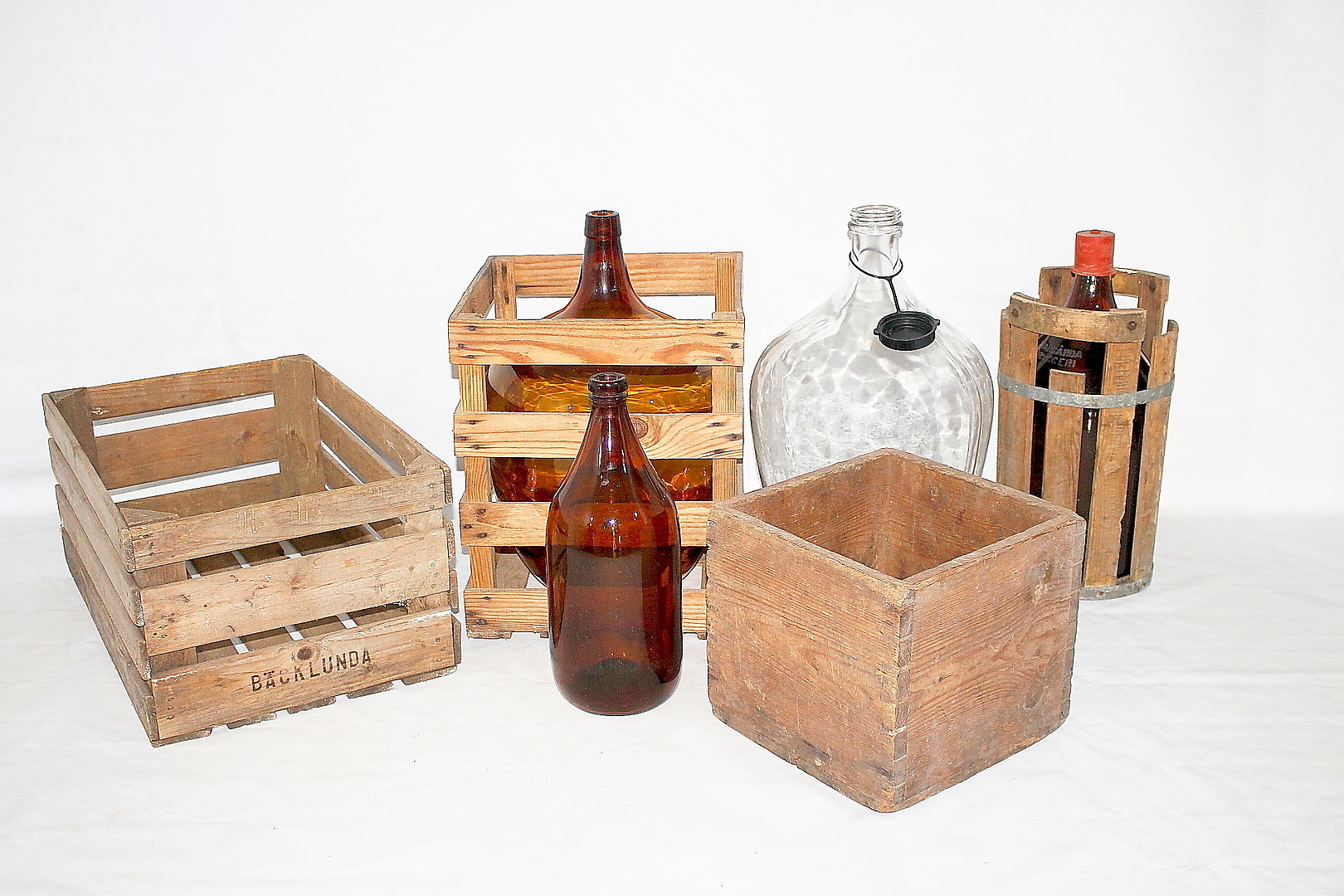 305802. HOLZKISTEN und FLASCHEN, 6 Teile.