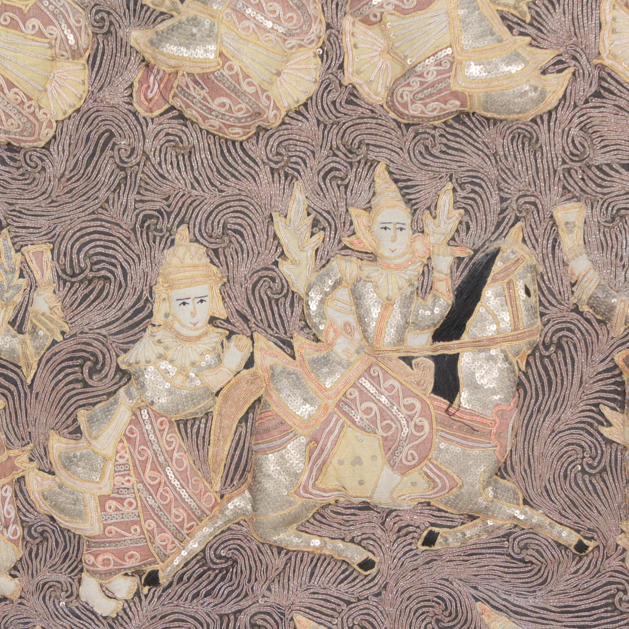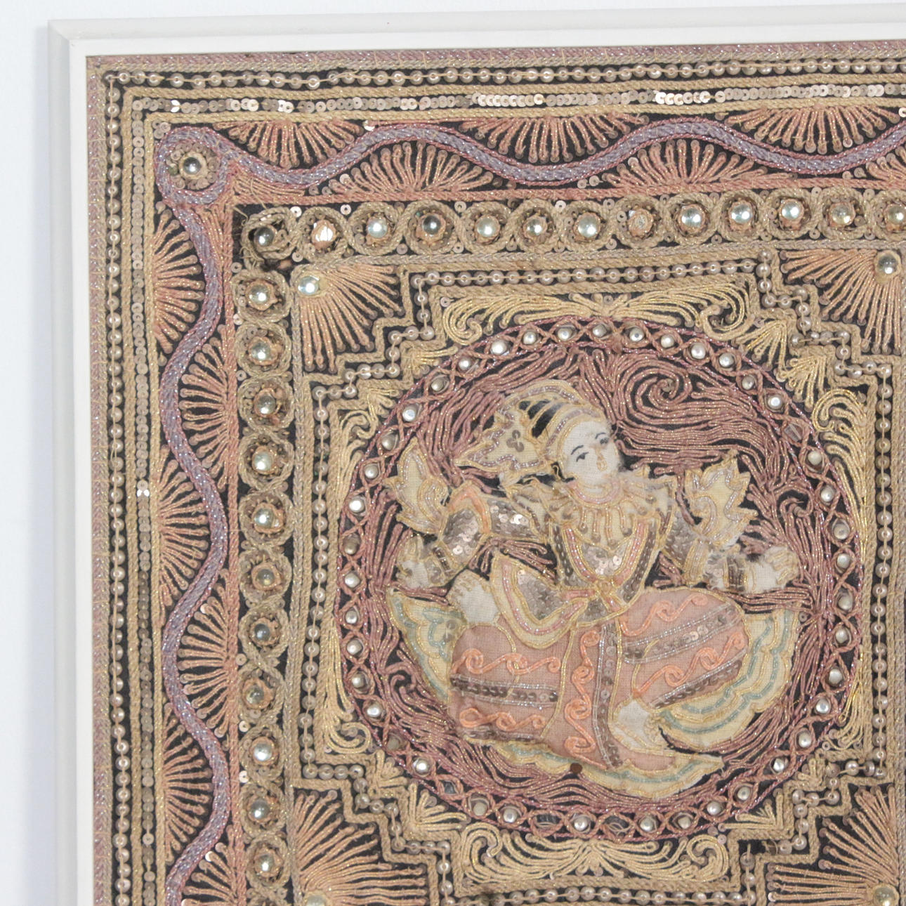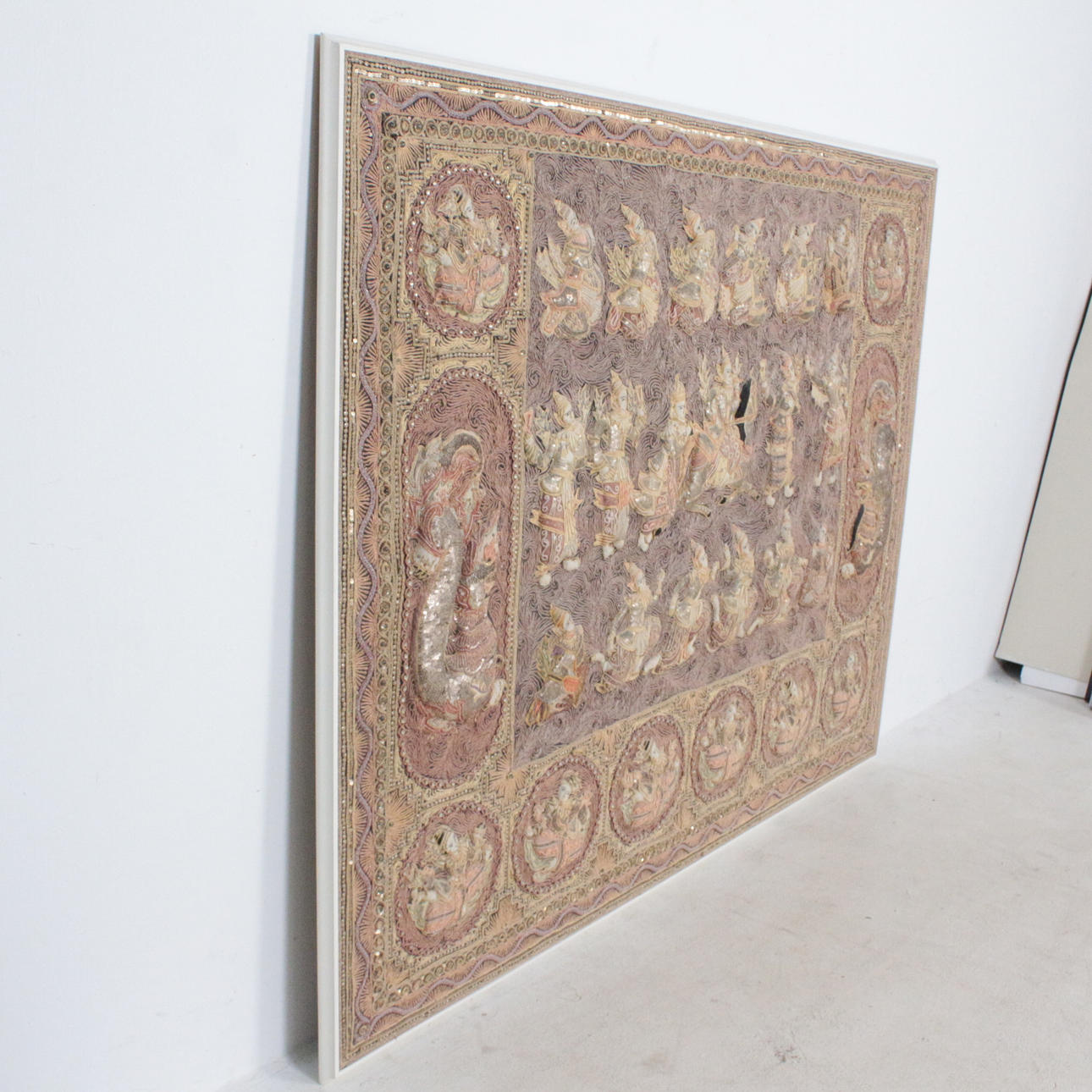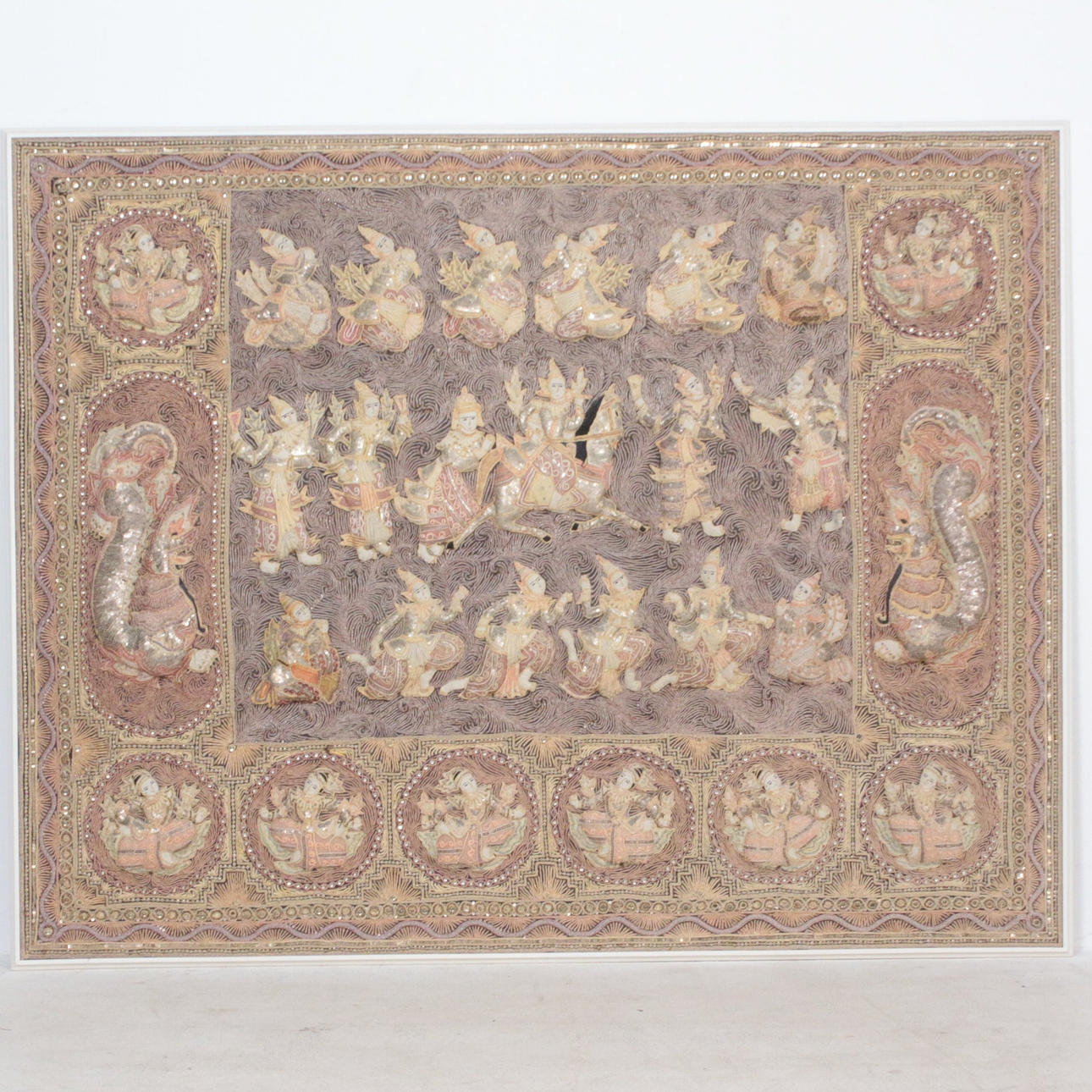 Orientalischer Kalaga Wandbehang aus Burma, Pailletten und buntem Garn, Figuren gefüttert, im Holzrahmen,