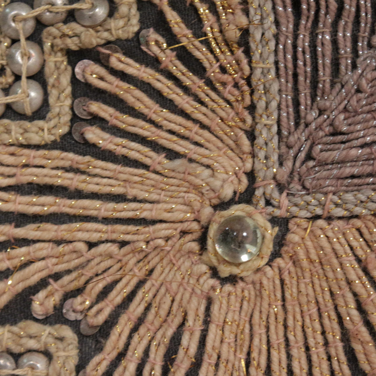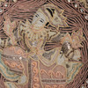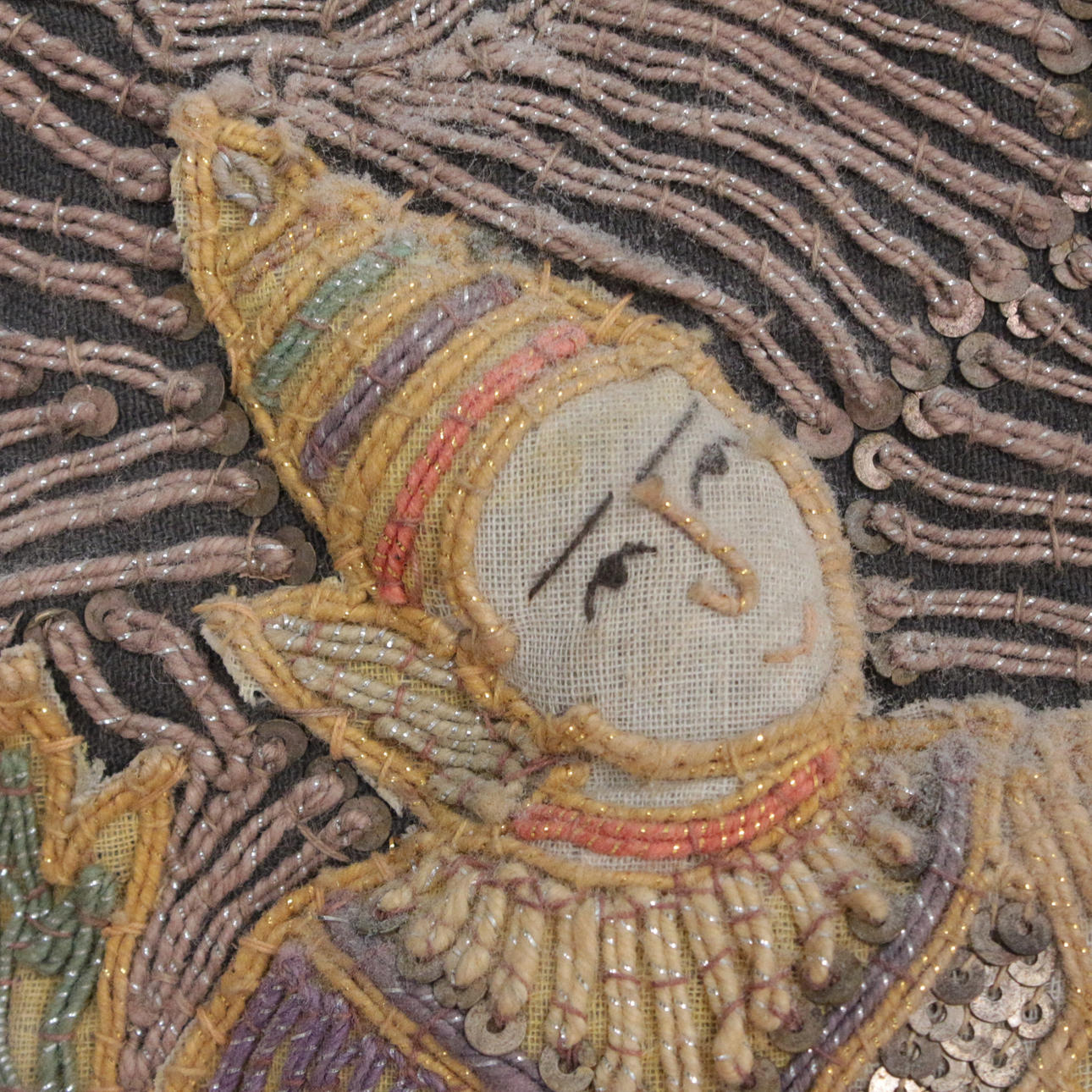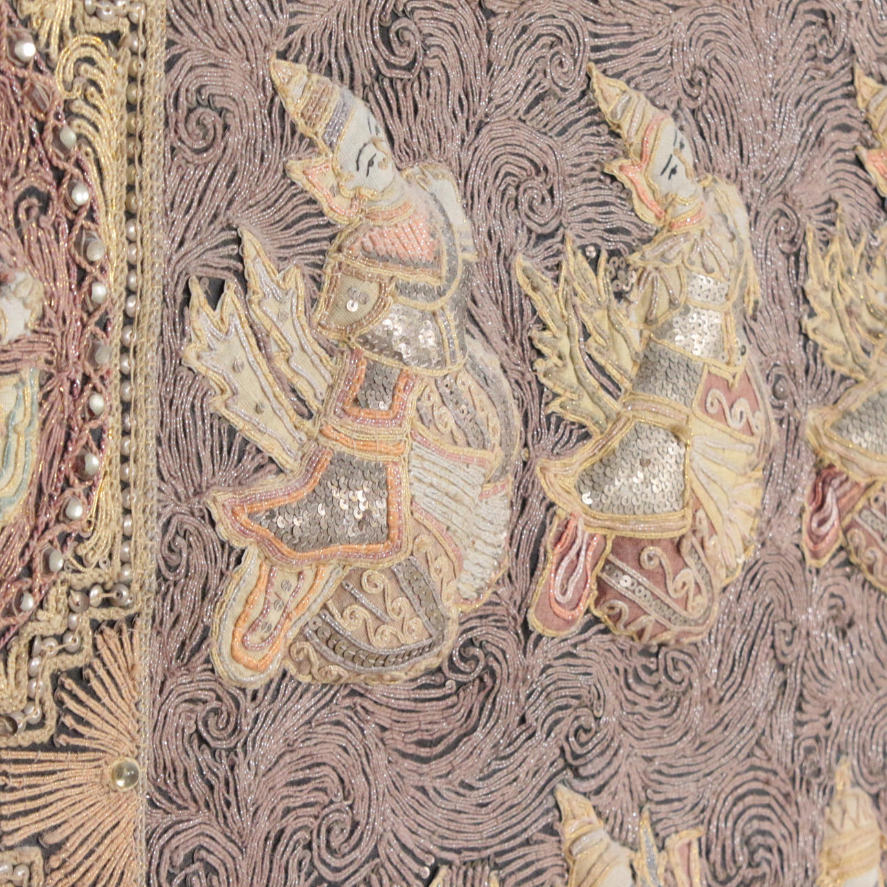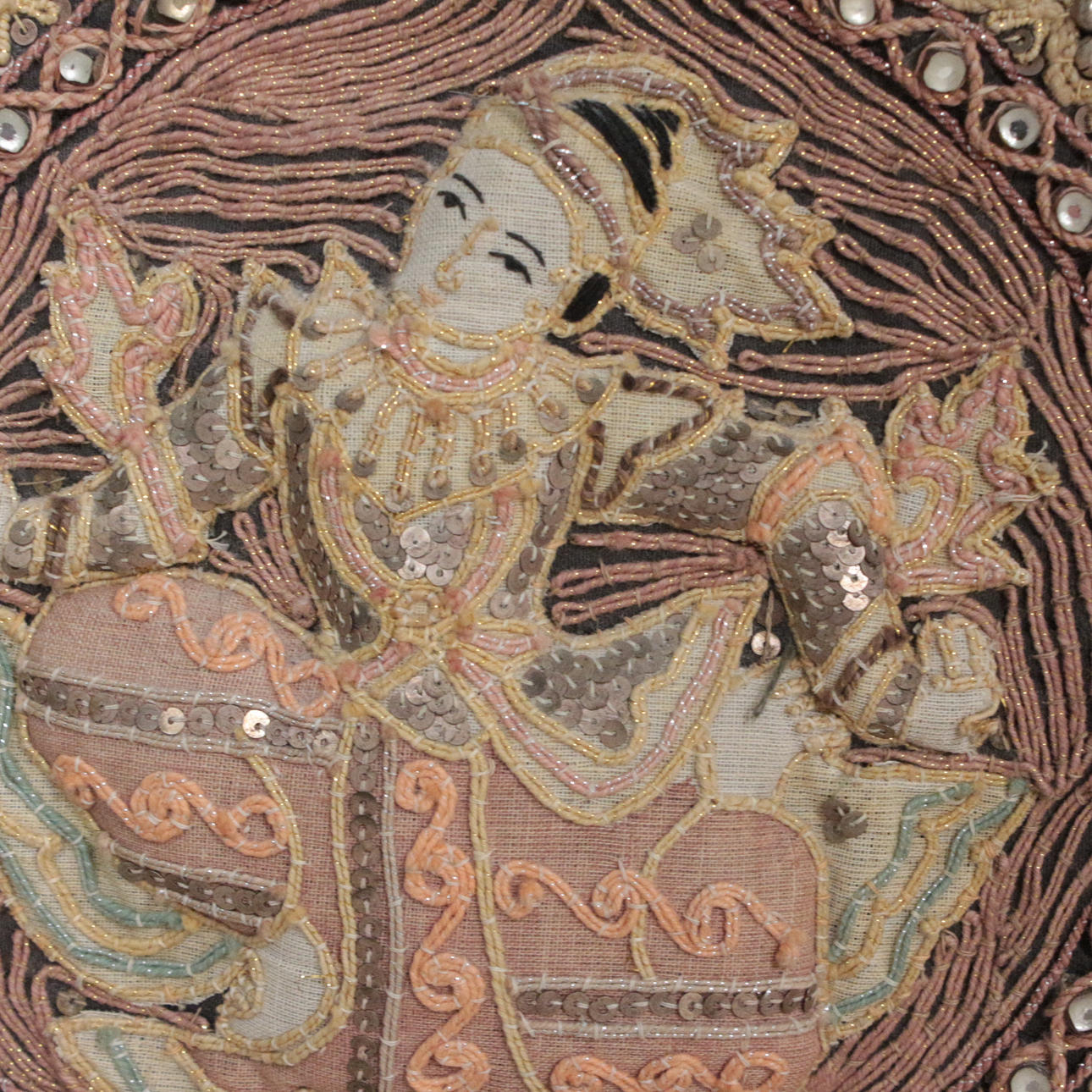 Orientalischer Kalaga Wandbehang aus Burma, Pailletten und buntem Garn, Figuren gefüttert, im Holzrahmen,