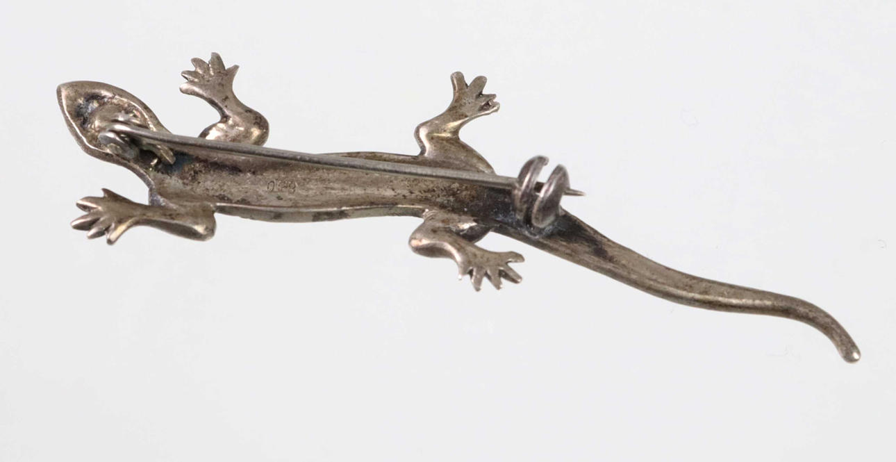 Brosche in Form eines Salamanders oder Eidechse in Silber 830, naturalistische Ausführung mit Markasiten besetzt, Augen rubinrote Steine, rückseitig mit Nadel
