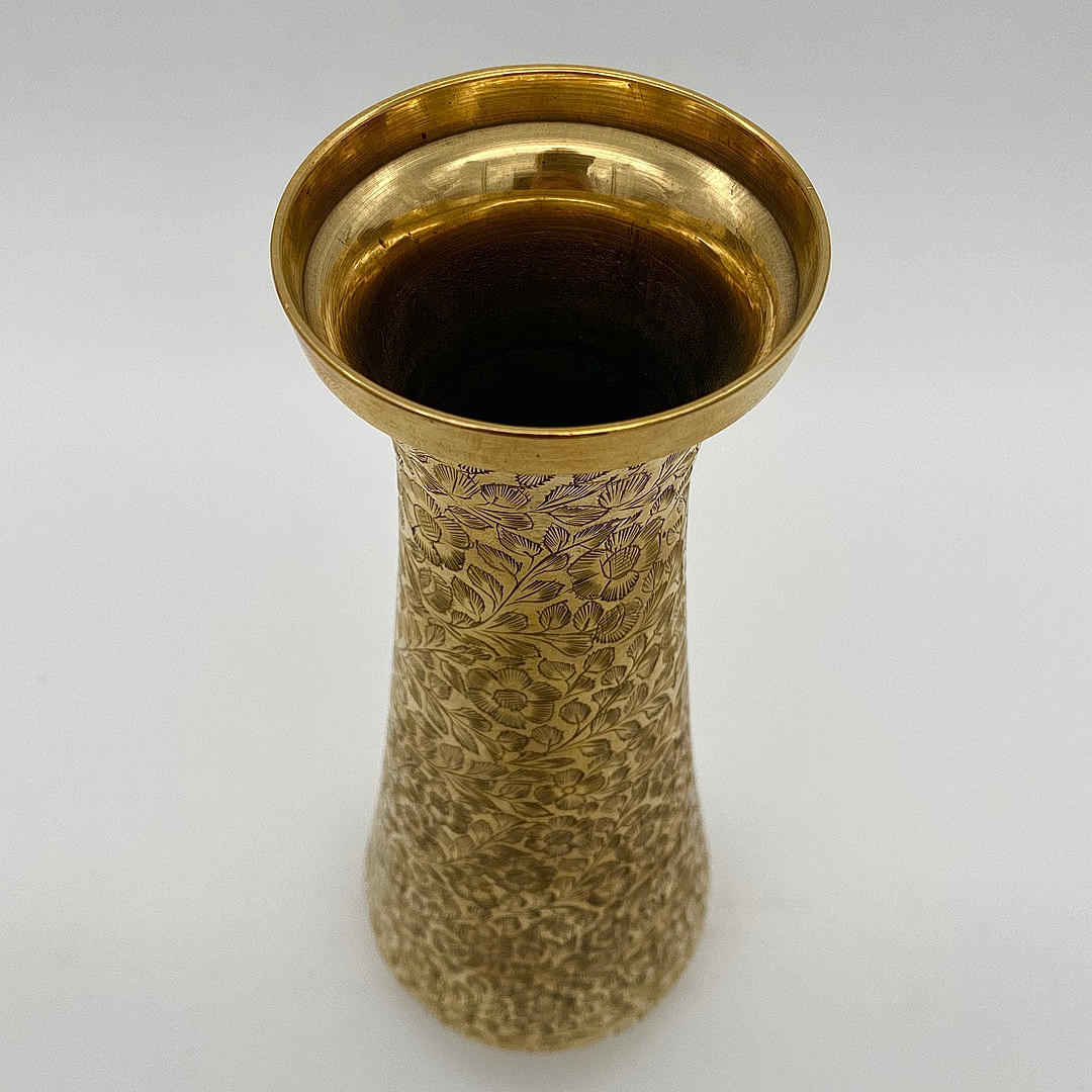 Vintage Vase aus geätztem Messing. Goldfarben, florales Muster. Handarbeit aus Indien.