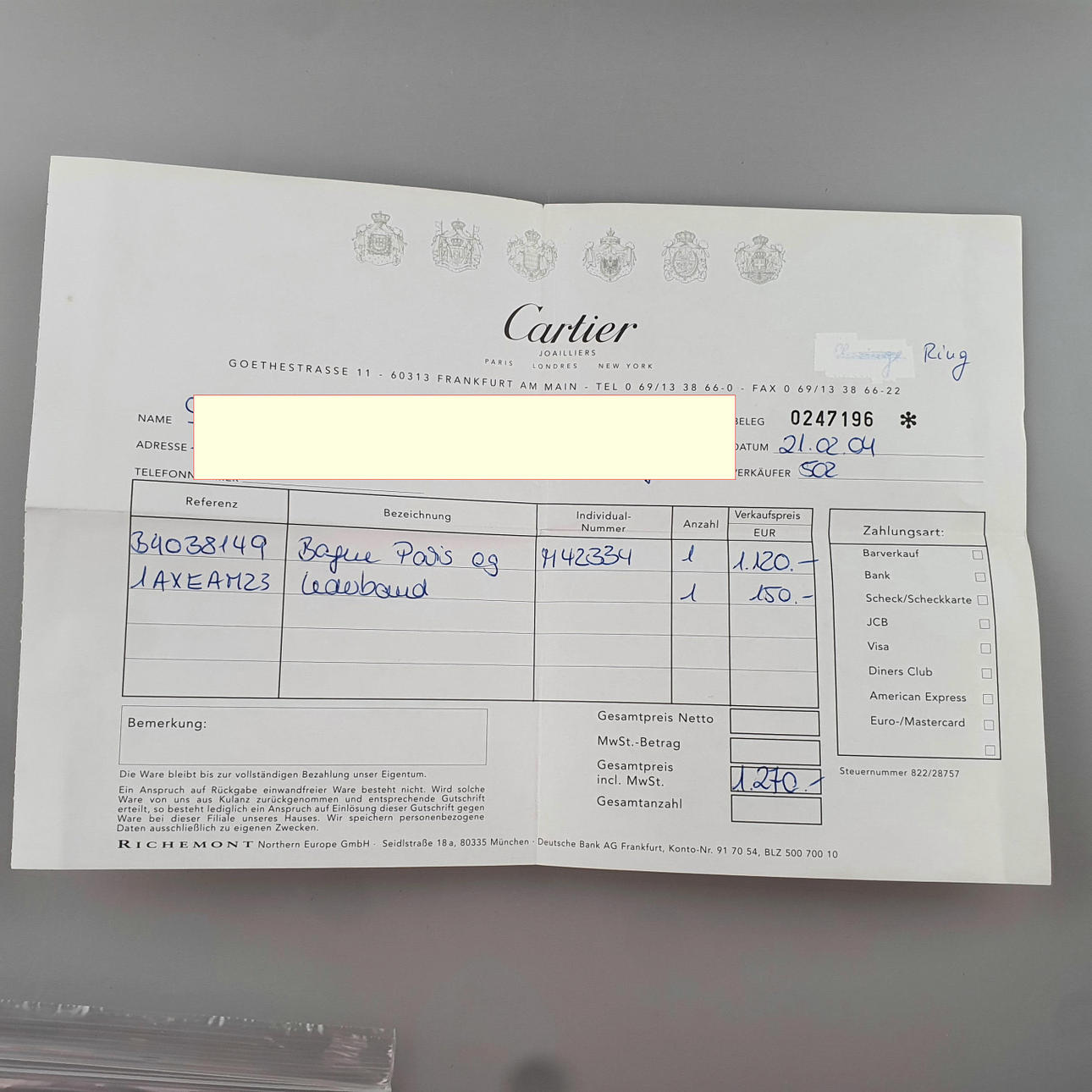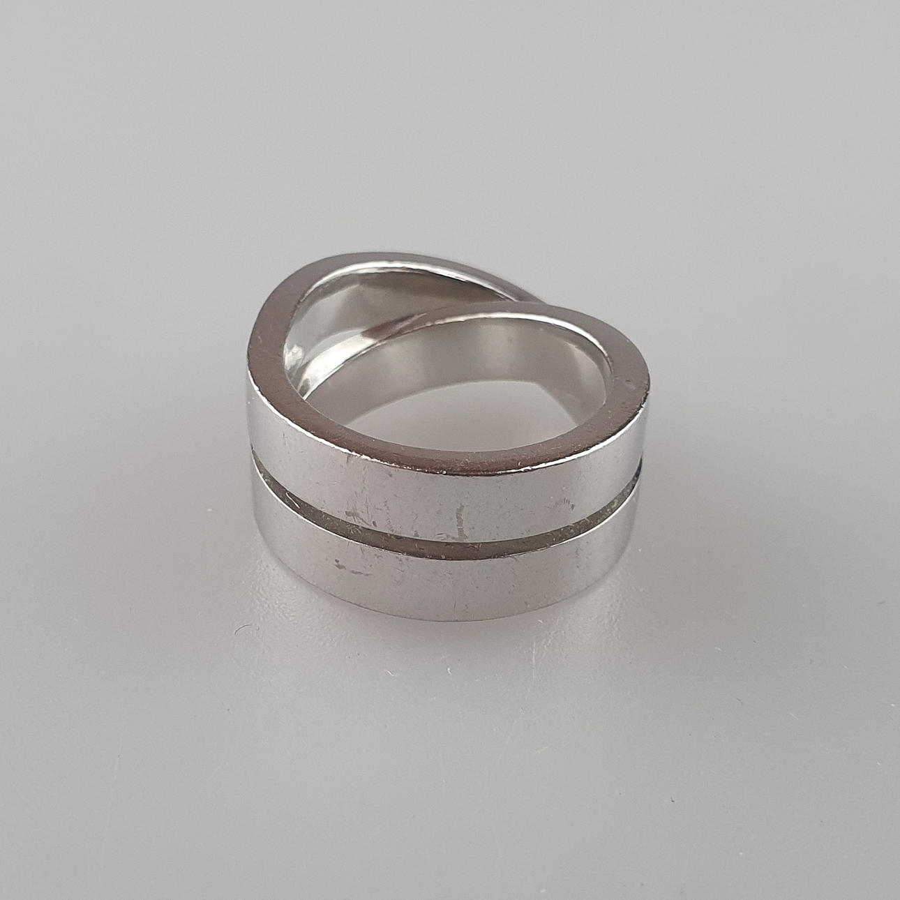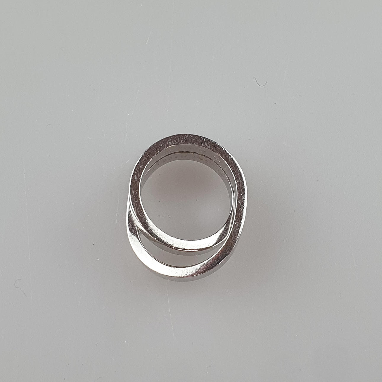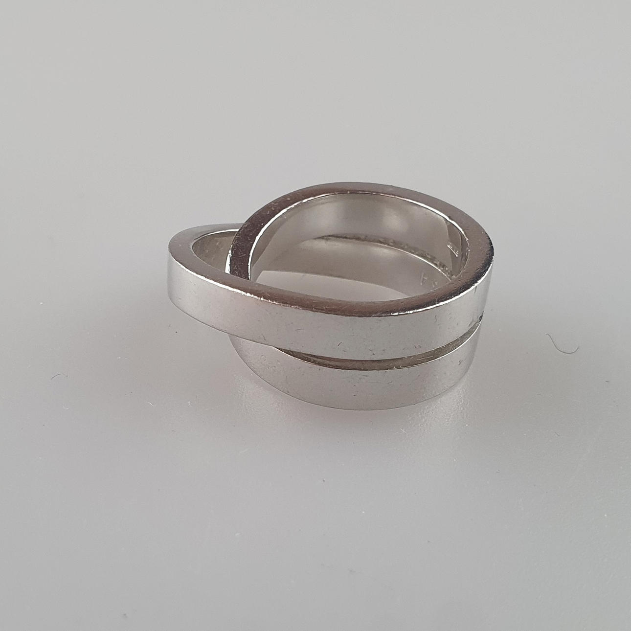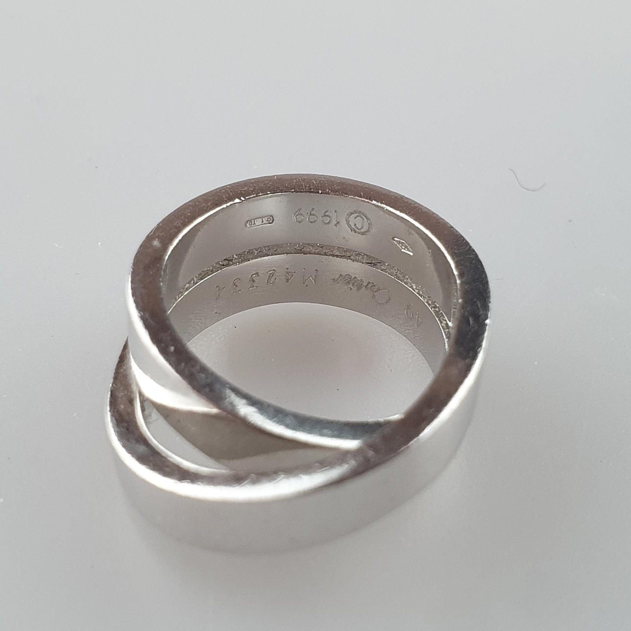 Weißgold 750/000 (18 K), massive, glatte, gekreuzte Schiene, innen mehrfach gestempelt u.a. „Cartier M 42334 750 © 1999“, Ringgröße 50/51, Gesamtgewicht ca. 15,7 g, beigegeben zugehöriges Original-Zertifikat von Cartier, Original-Kaufbeleg von Cartier / Frankfurt a.M. (2004) liegt dem AH vor.