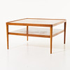 Eiche. Quadratische Scheibe mit darunter liegender Zeitungsablage. 90 x 90, Höhe 50 cm.