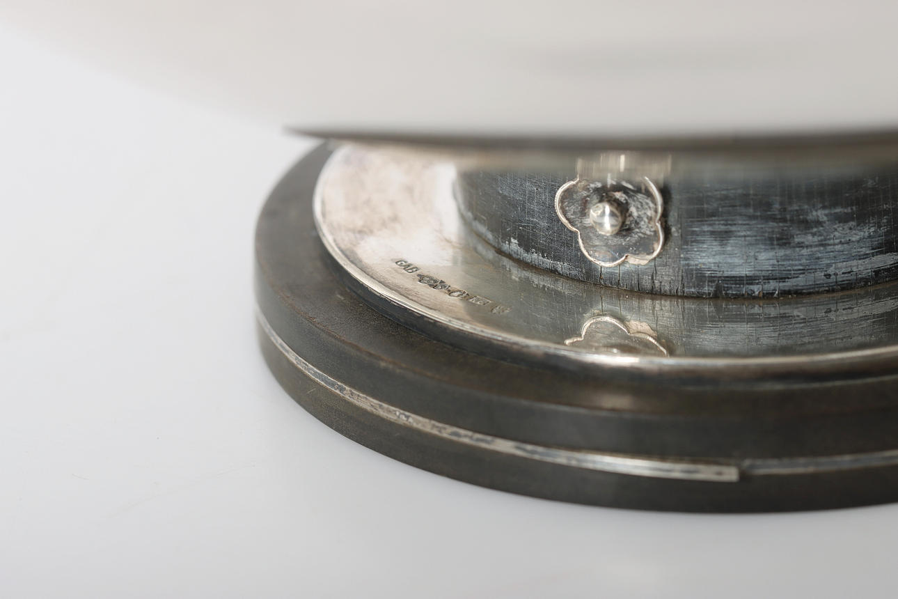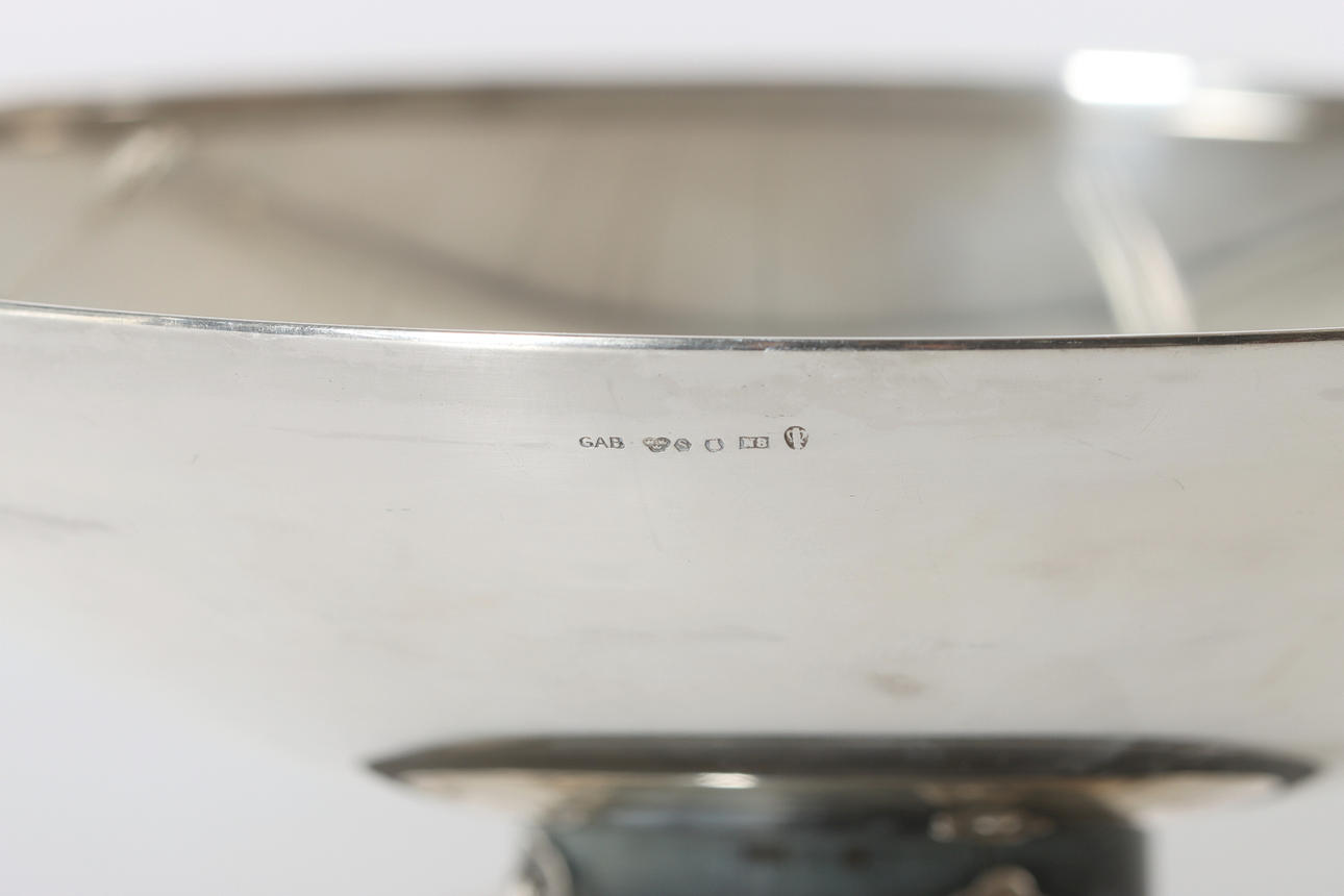 Silberschale auf Fuß, Bakelitfuß mit silbernem Blumendekor. Gestempelt GAB, N8 (1939) Höhe 8,5 cm Durchmesser 22,5 cm Gewicht 544 Gramm.
