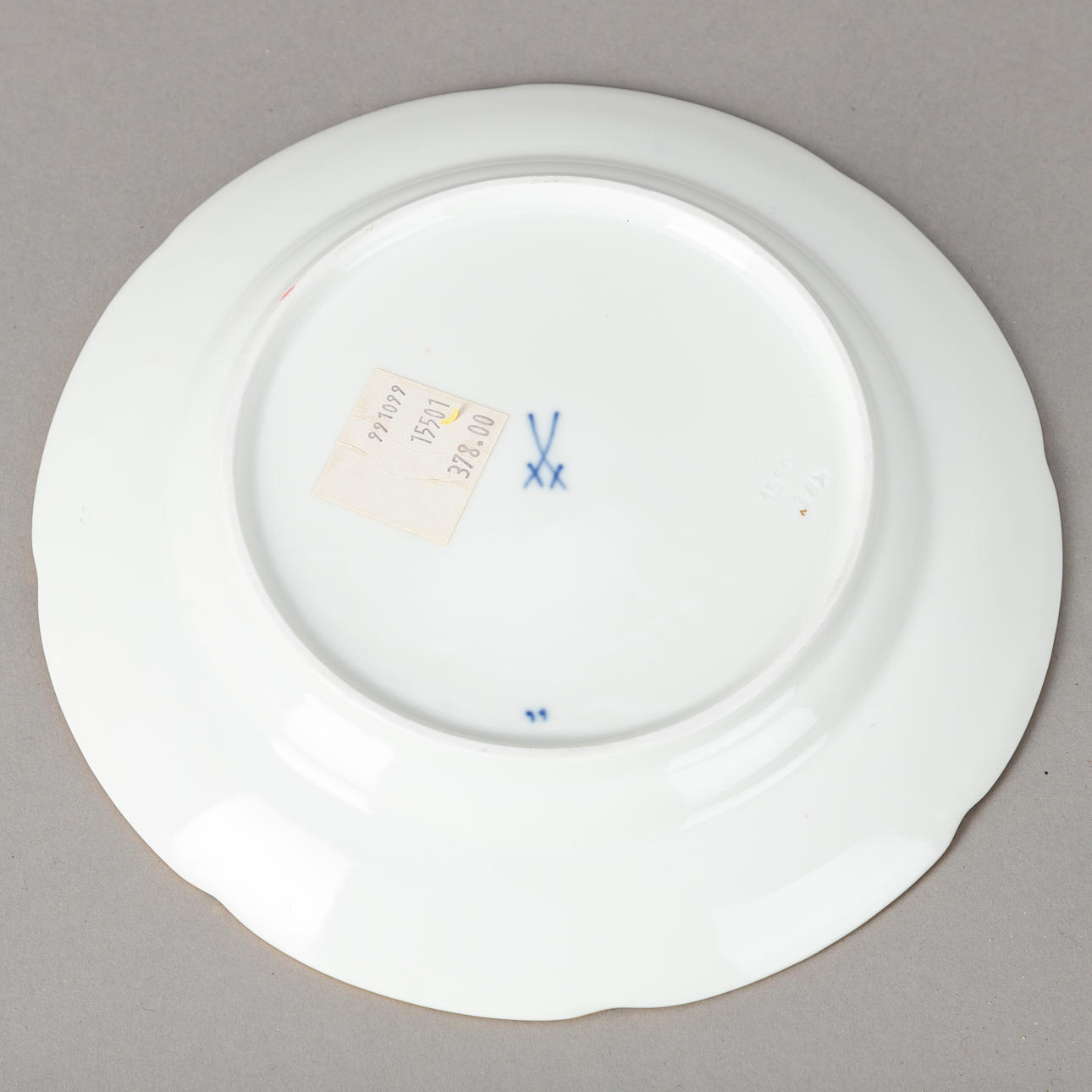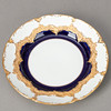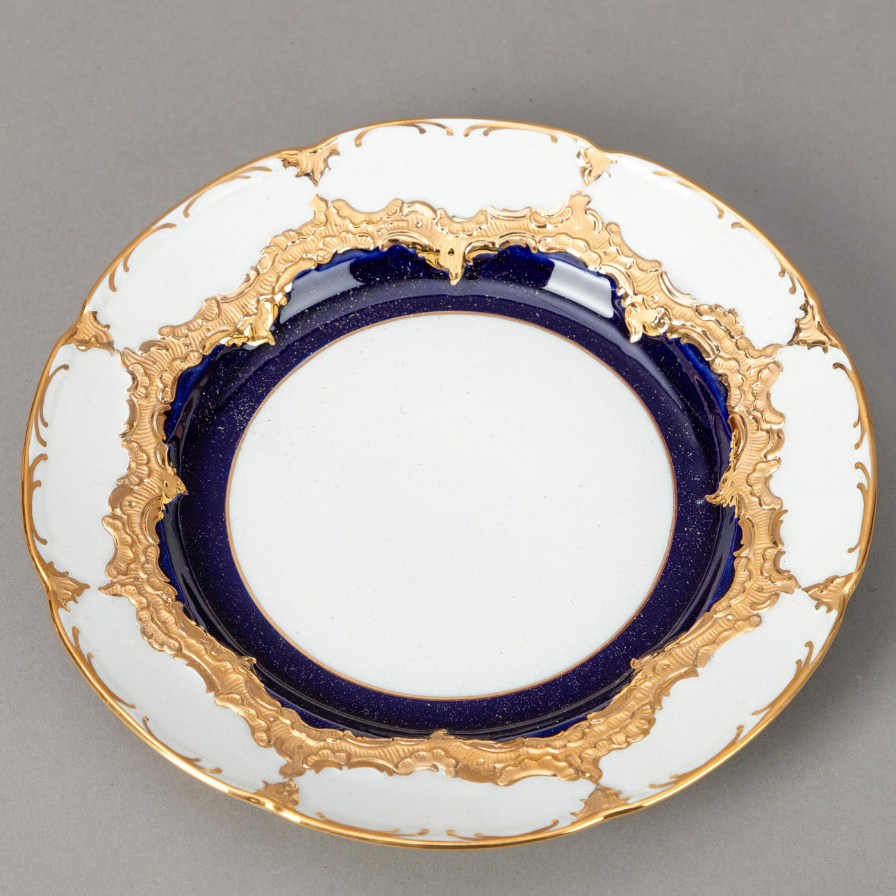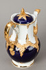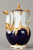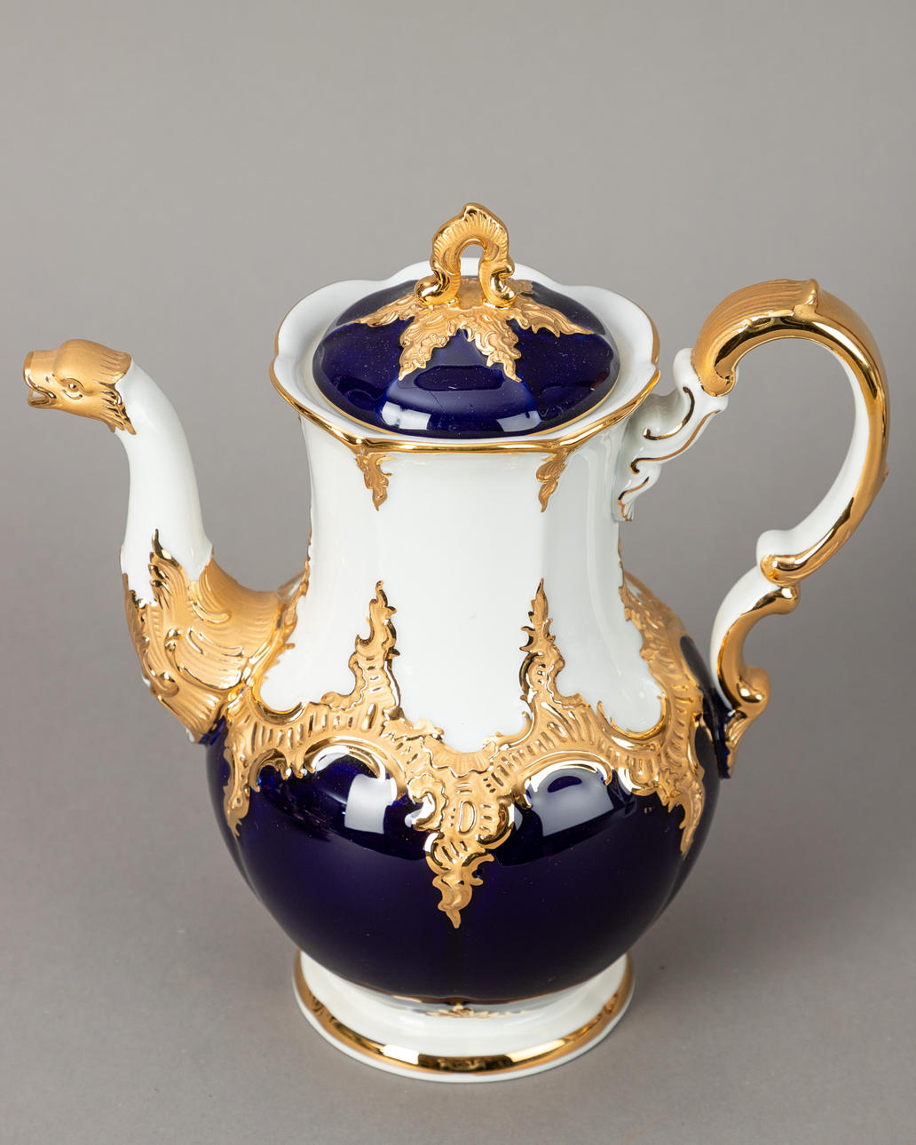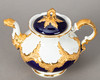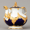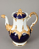 Weißporzellan mit kobaltblauer Unterglasurbemalung, Goldstaffagen matt und radiert. B-Form, nach einem Entwurf von Ernst August Leuteritz. Unterglasurblaue Schwertermarke, Modell-Nr. und Malerzeichen. 21-tlg., bestehend aus 1 Kaffeekanne, 1 Teekanne ( 1-fach durchschliffen), 1 Sahnegießer, 6 Tassen, 6 Untertassen und 6 Kuchentellern.