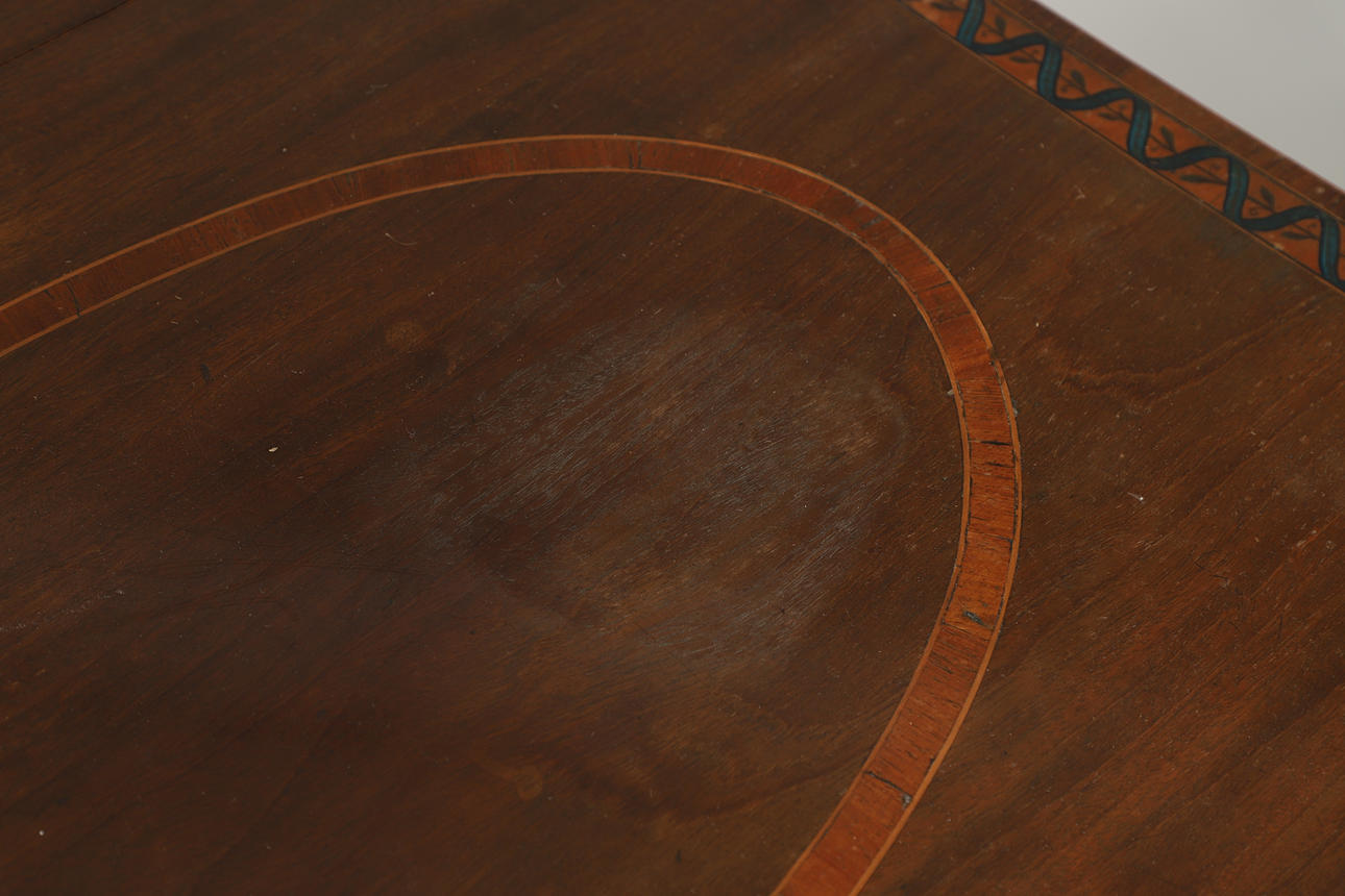 Einige Chips an den Furnieren an den Rändern der Klappen und in der Nähe der Scharniere, einige Chips am Furnier an den Kanten der Tischplatte, allgemeine Abnutzung mit einigen Kratzern und Flecken im Laufe der Zeit.