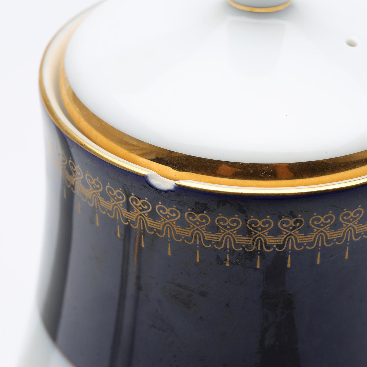 Verschleiß, Kaffeeuntertasse fehlt, Chips am oberen Rand der Kaffeekanne.