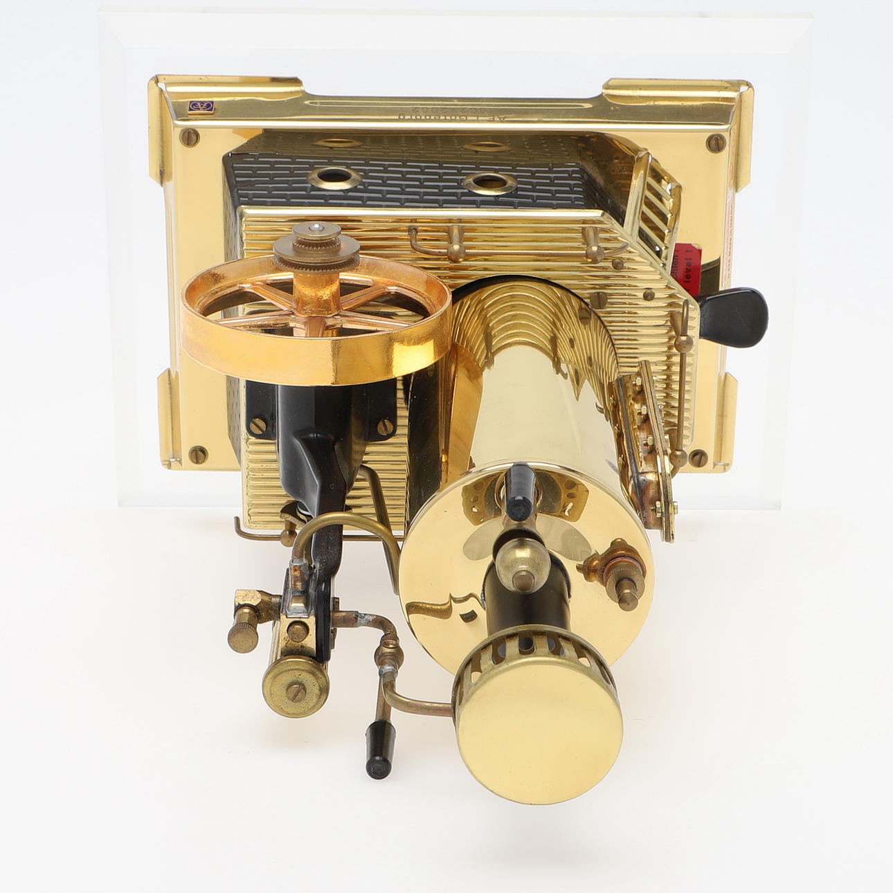 Auf einer Platte aus Acrylglas oder ähnlichem Material montiert. Auf einer Längsseite des Sockels befindet sich das Logo und die Gravur von ÅF: „ÅF in Göteborg 1902 – 2002“.