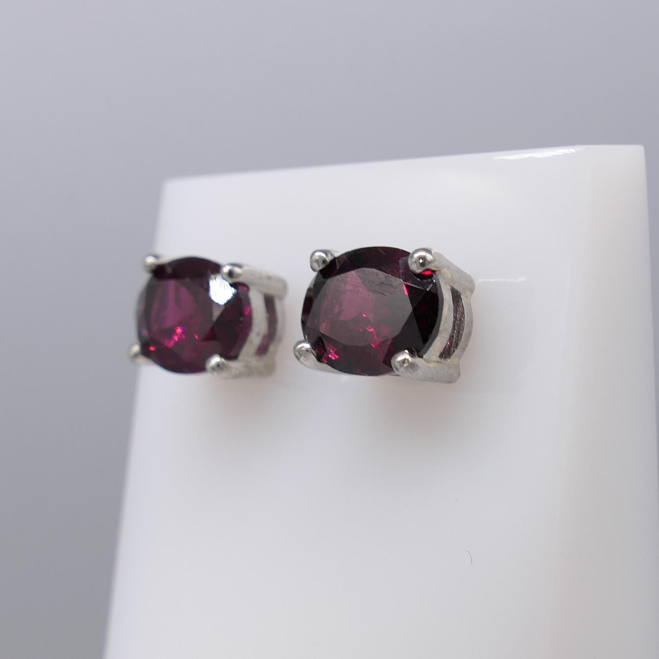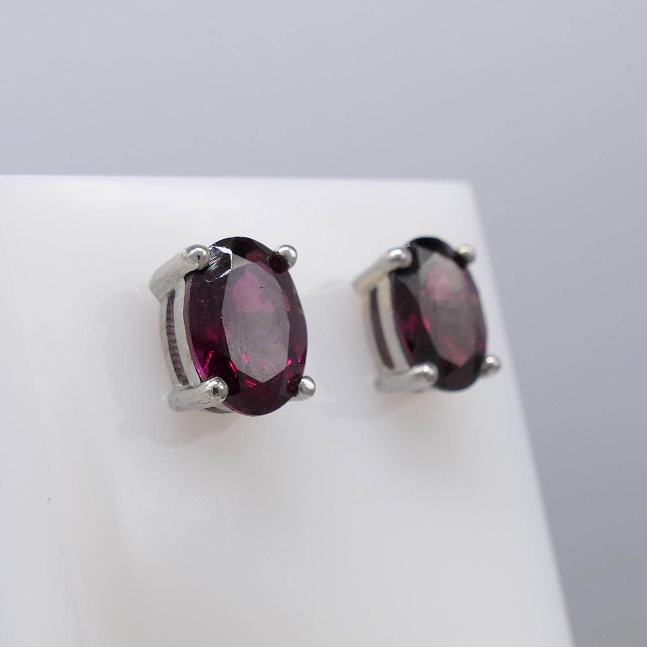 Jeder Ohrstecker in diesem Paar ist mit einem einzelnen rötlich-violetten Granat mit den Maßen 8 x 6 mm besetzt.