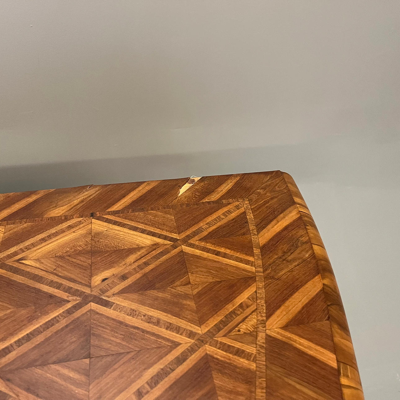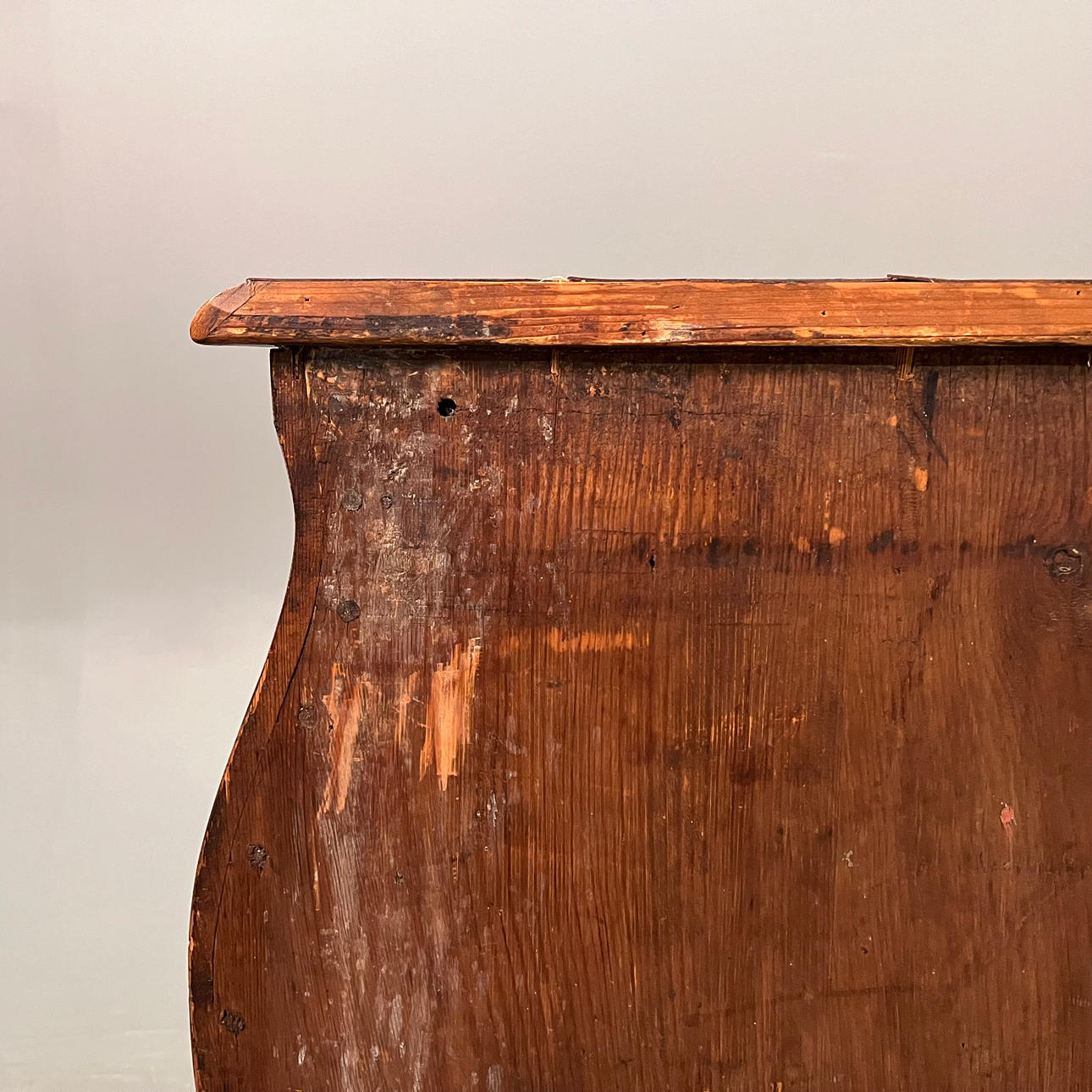 Altersbedingte Gebrauchsspuren, Furnierschäden, Risse, lose Befestigung, späteres Schloss, Schlüssel fehlt.