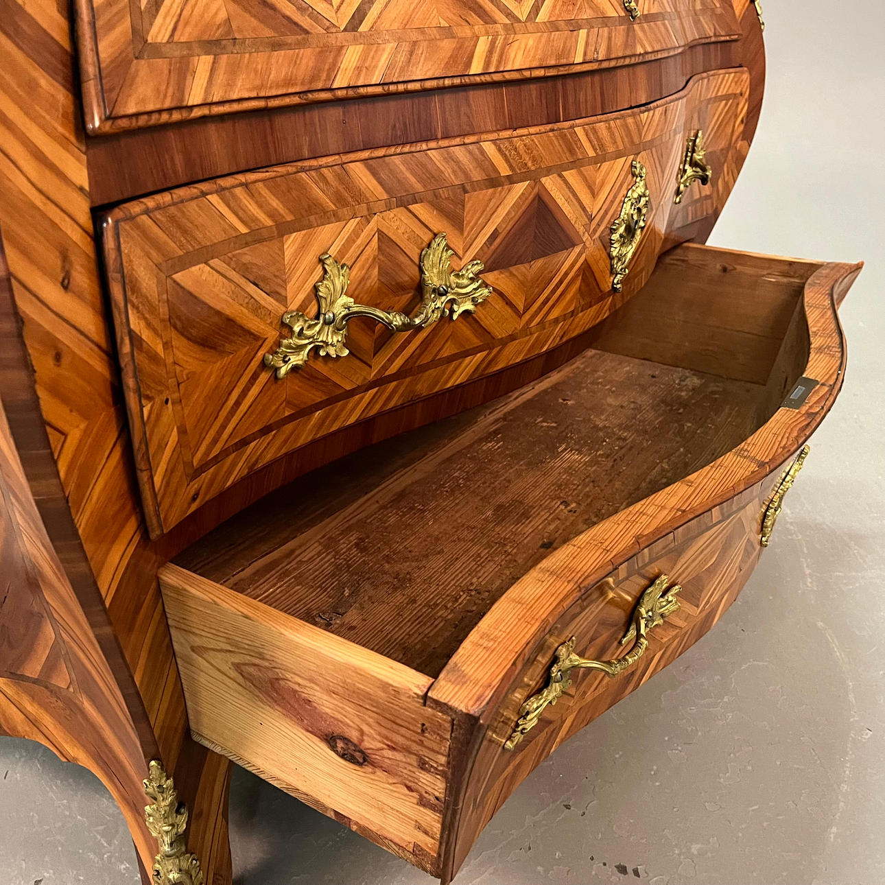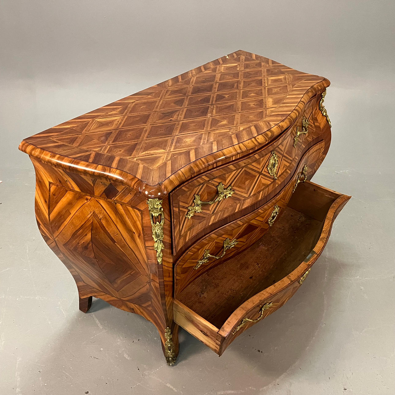 Vergoldete Messingbeschläge, furniert in verschiedenen Holzarten. Länge ca. 117 cm, Breite ca. 60 cm, Höhe ca. 82 cm.