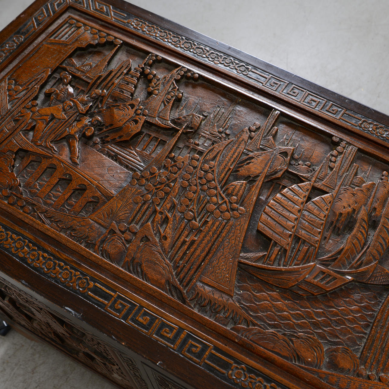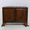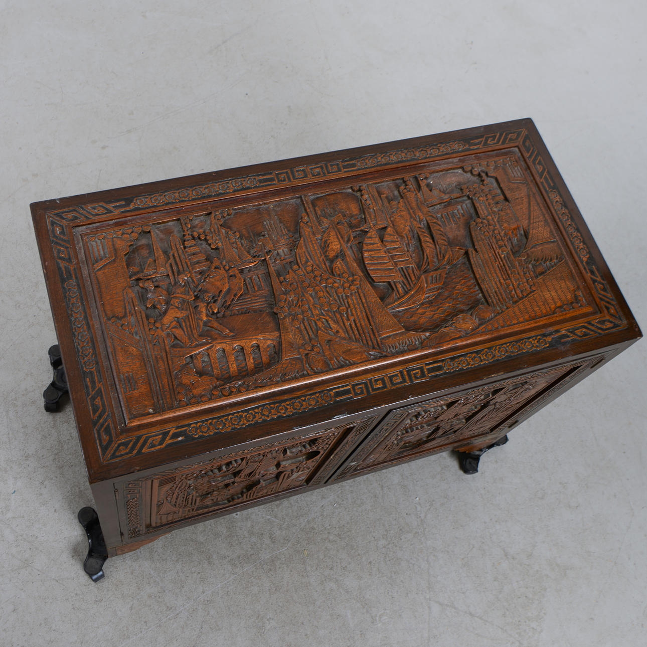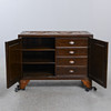 Geschnittenes Reliefdekor. Interne Regale und Schubladen. Länge 101 cm. Tiefe 50 cm. Höhe 76 cm.