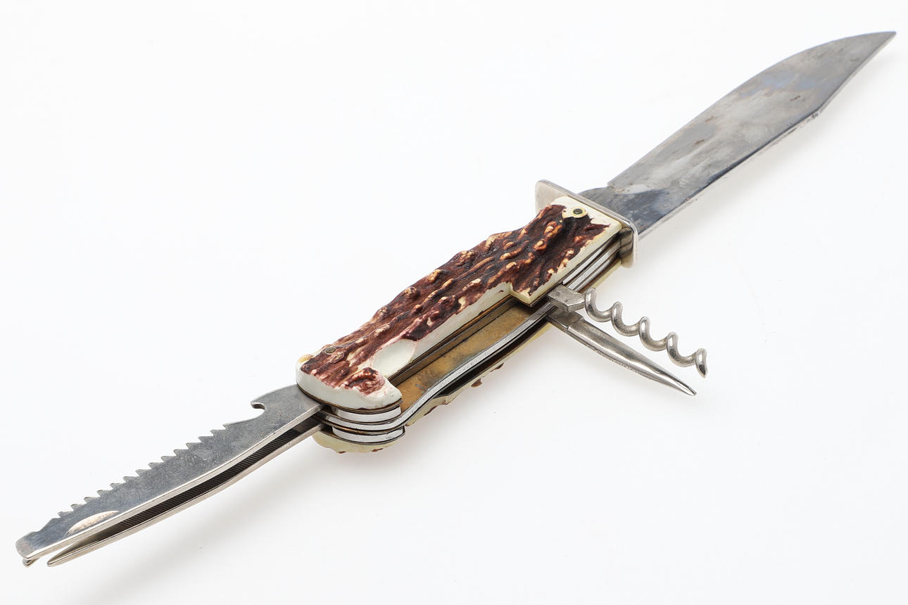 Klappbarer Korkenzieher, Feile und Minisäge.