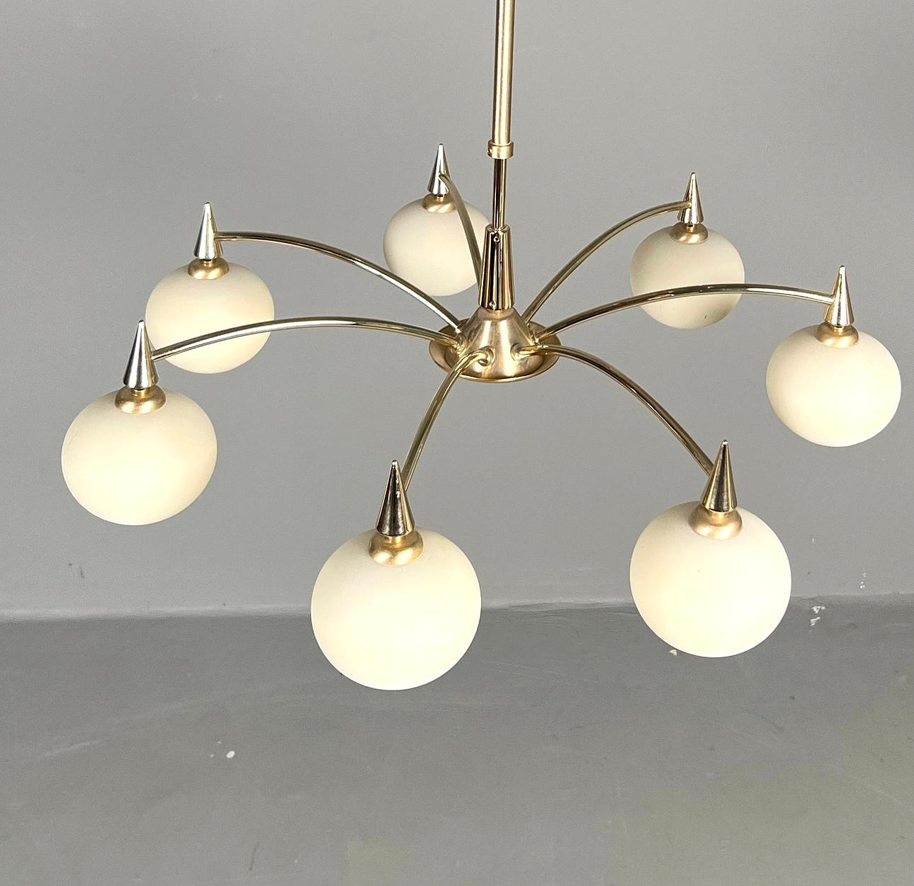 Sechsarmige Konstruktion mit weissen Glaskuppeln. Höhe 73 cm, Ø 60 cm.