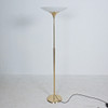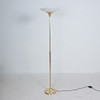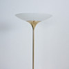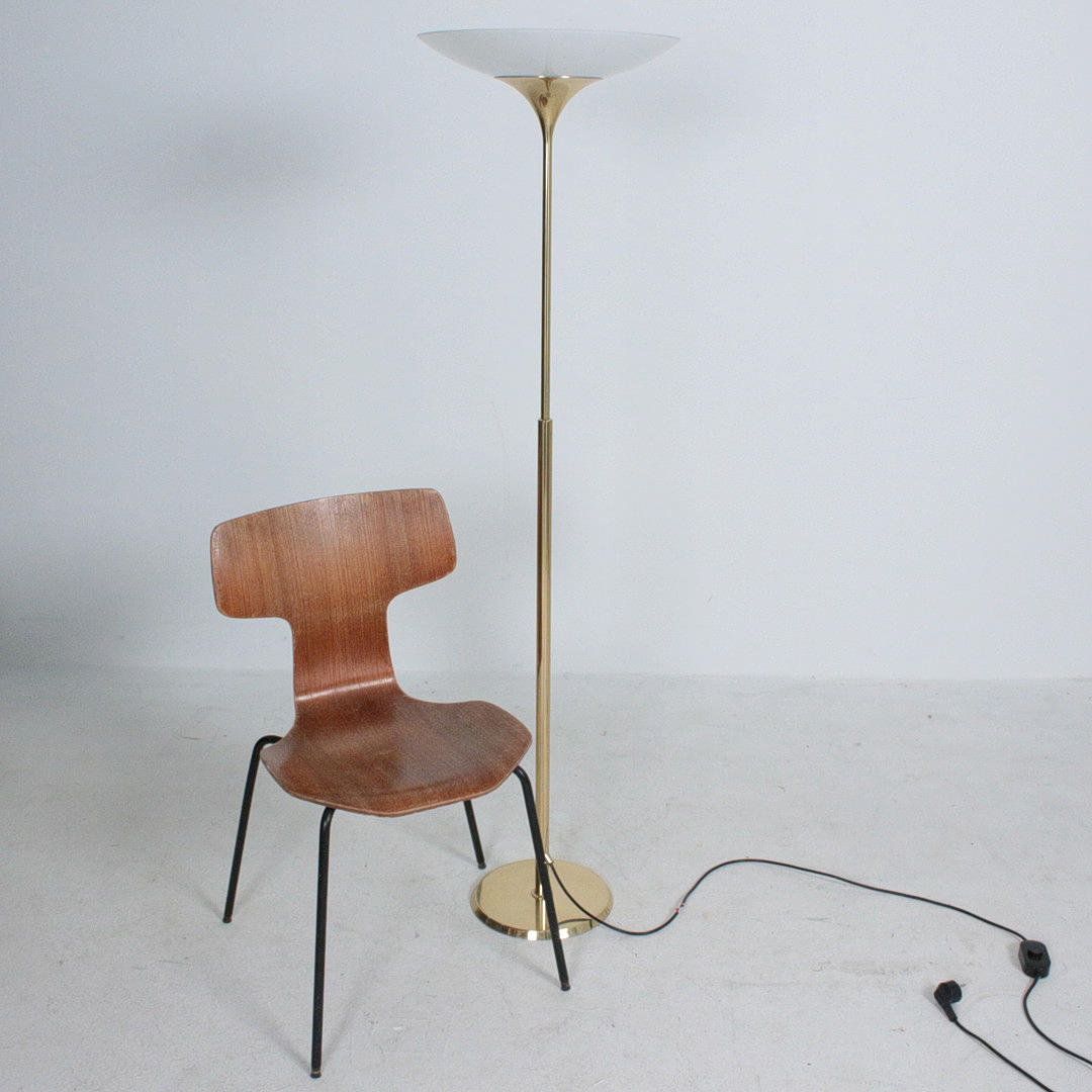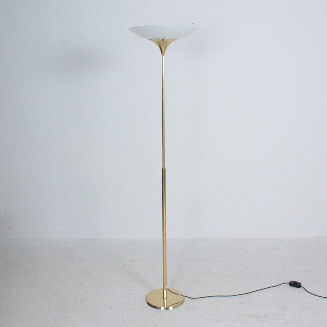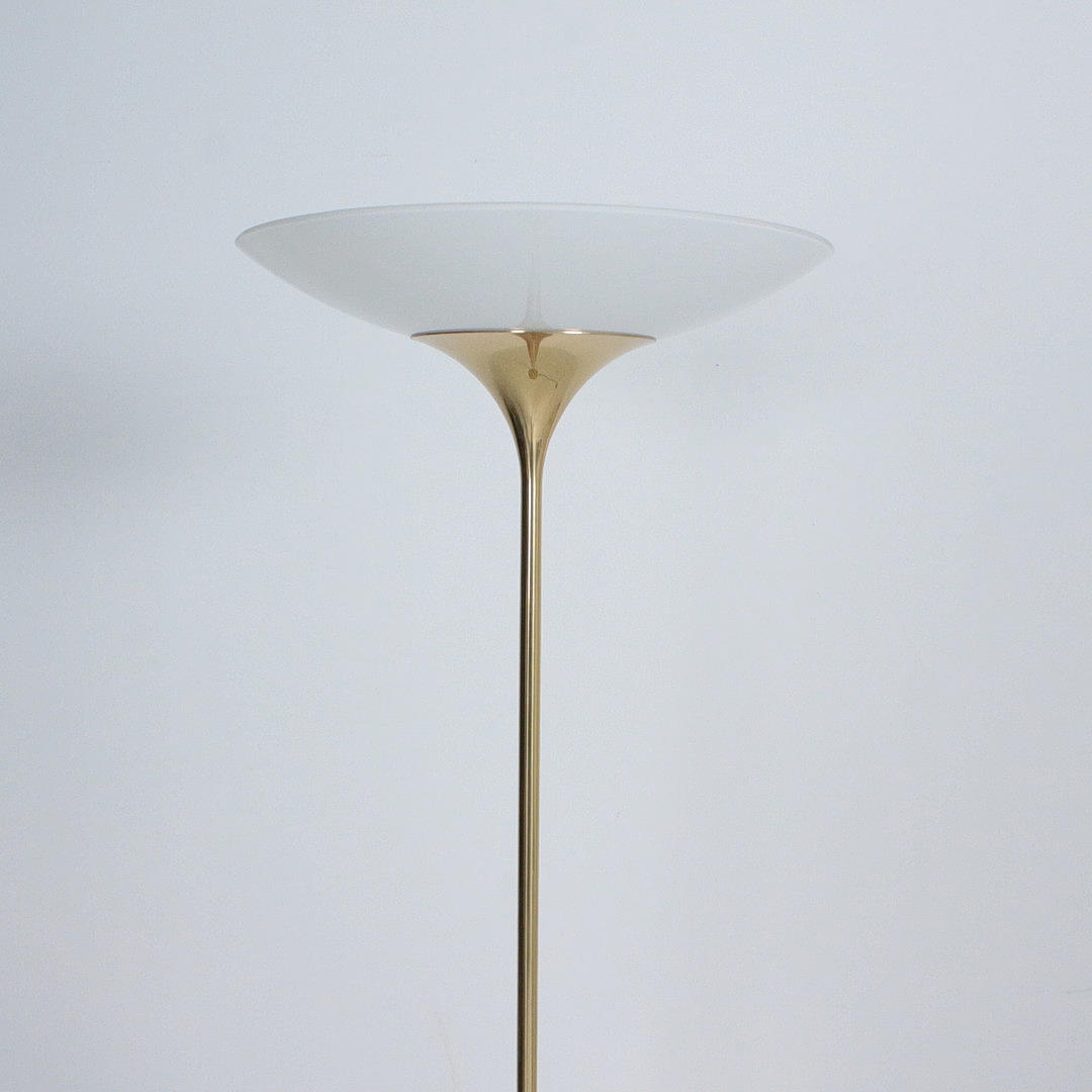 Florian Schulz, Stehleuchte / Deckenfluter, Modell 'Taos', Messing, Opalglas, Deutschland. Konstruktion aus Messing mit rundem Standfuß und nach oben offenem Schirm aus Opalglas, ausgestattet mit einer Brennstelle, höhenverstellbar.