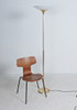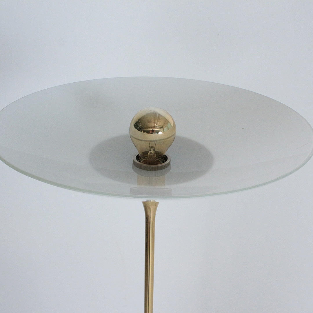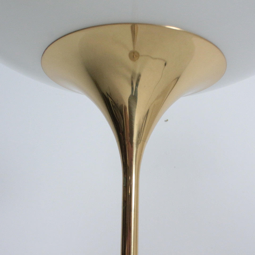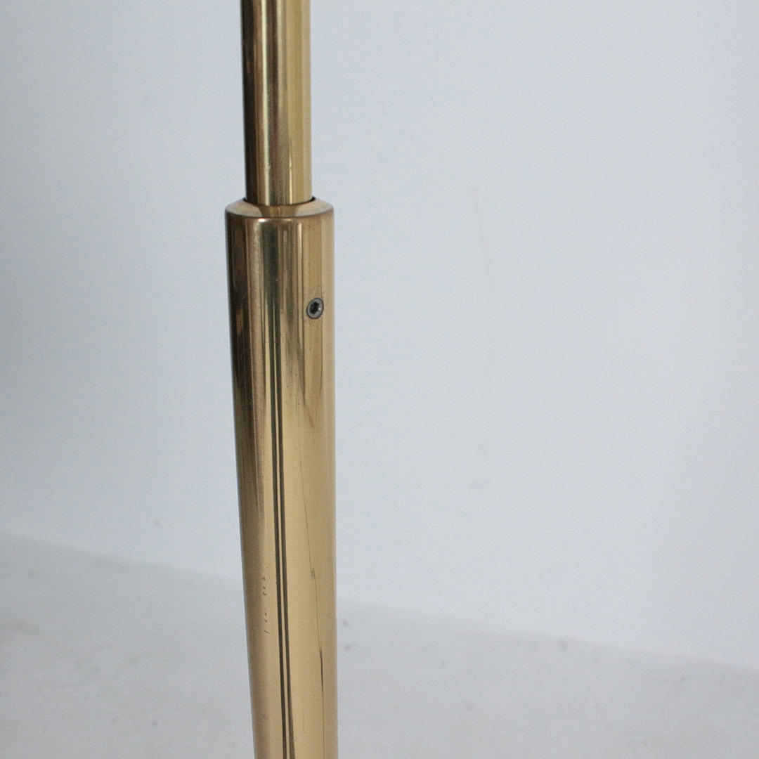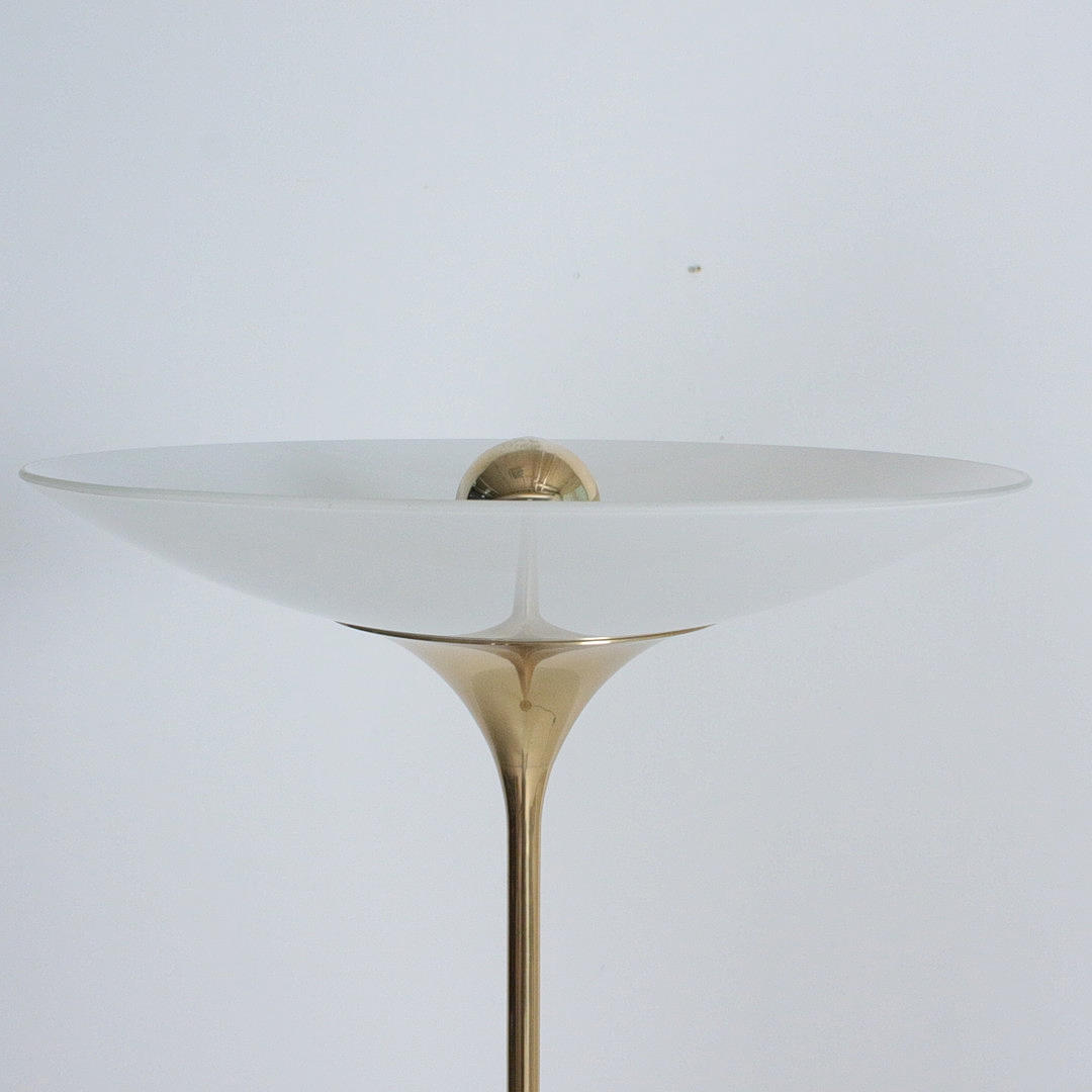 Florian Schulz, Stehleuchte / Deckenfluter, Modell 'Taos', Messing, Opalglas, Deutschland. Konstruktion aus Messing mit rundem Standfuß und nach oben offenem Schirm aus Opalglas, ausgestattet mit einer Brennstelle, höhenverstellbar.