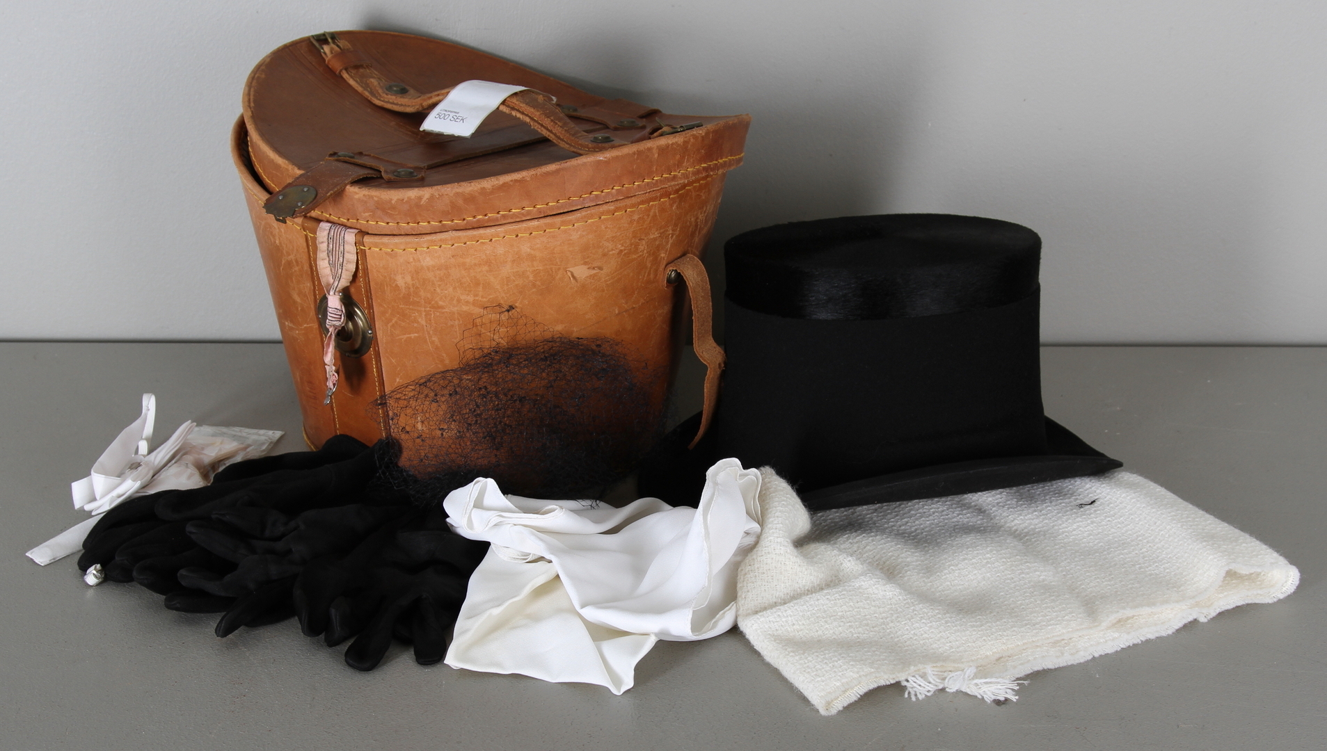 30910. HUTTASCHE, Leder mit Sturmhut und Frackzubehör.