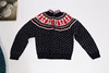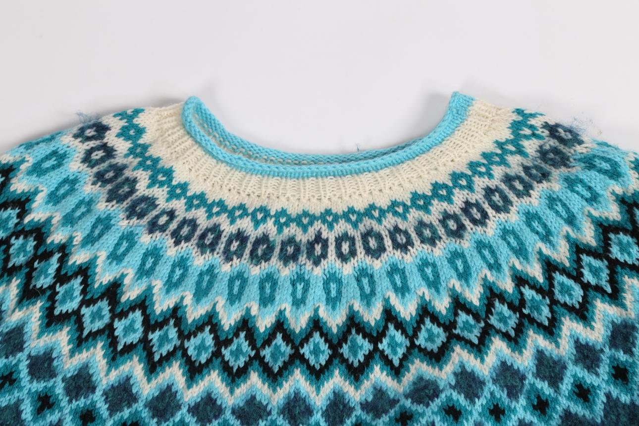 Der Kinderpullover ist nach einem traditionellen skandinavischen Muster gestrickt, 43 cm lang, 37 cm von Achsel zu Achsel.