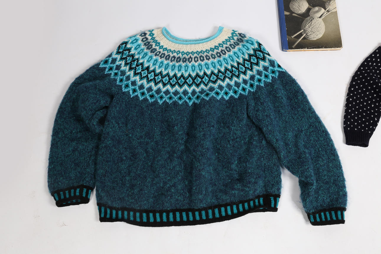 54. EIN NORDISCHER SKANDINAVISCHER HANDGESTRICKTER VINTAGE-PULLOVER, EIN HANDGESTRICKTER NORWEGISCHER PULLOVER FÜR KINDER UND EIN BUCH MIT STRICKMUSTERN.