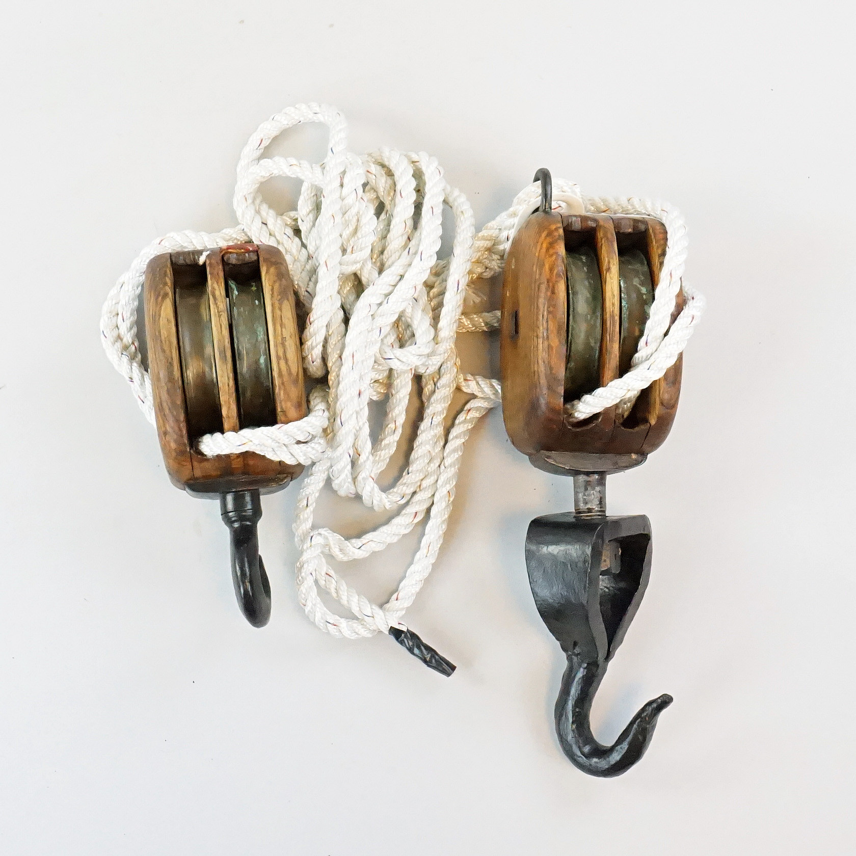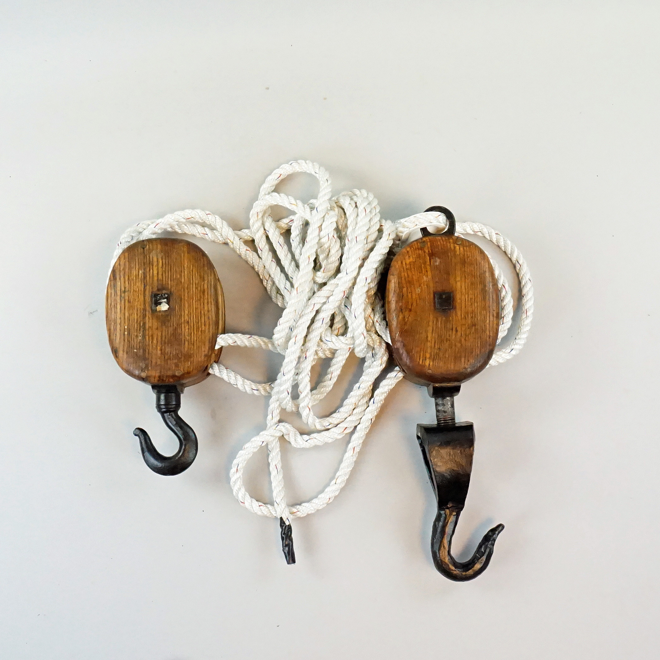3103552. TAILLE/BLOCK mit Seil, 2 Stück, Holz, Eisen.