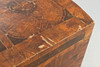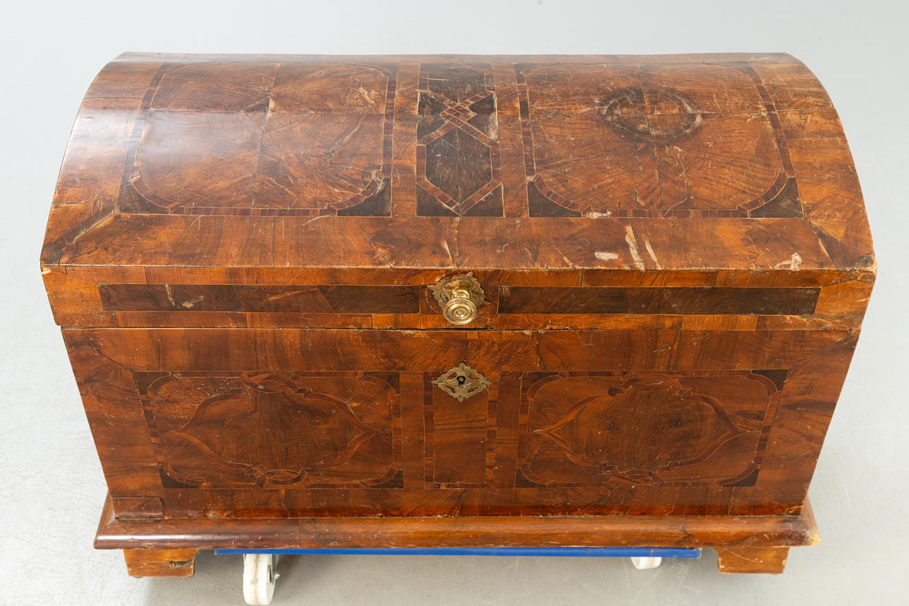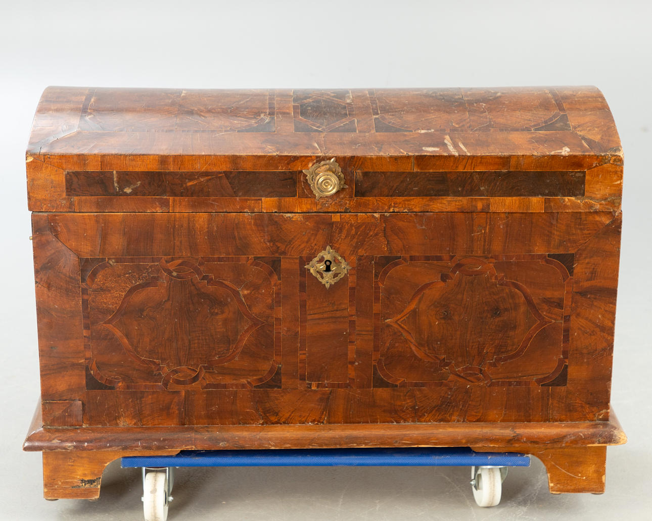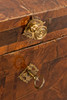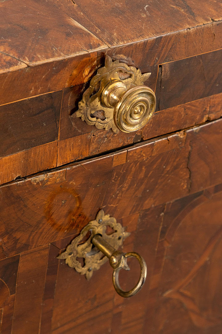Nußbaum u.a. Hölzer auf Nadelholz furniert. Rechteckiger, sich konisch weitender Korpus mit Runddeckel auf über Eck gestellten, geschwungen ausgeschnittenen Füßen. Vierseitig, gegliederte, furnierte Füllungen in rechteckiger Form, innen geschweift ornamentiert. Messingapplikationen in variierenden Ausführungen mit Restvergoldungen.. HxBxt: ca. 77 x 109 x 56 cm.