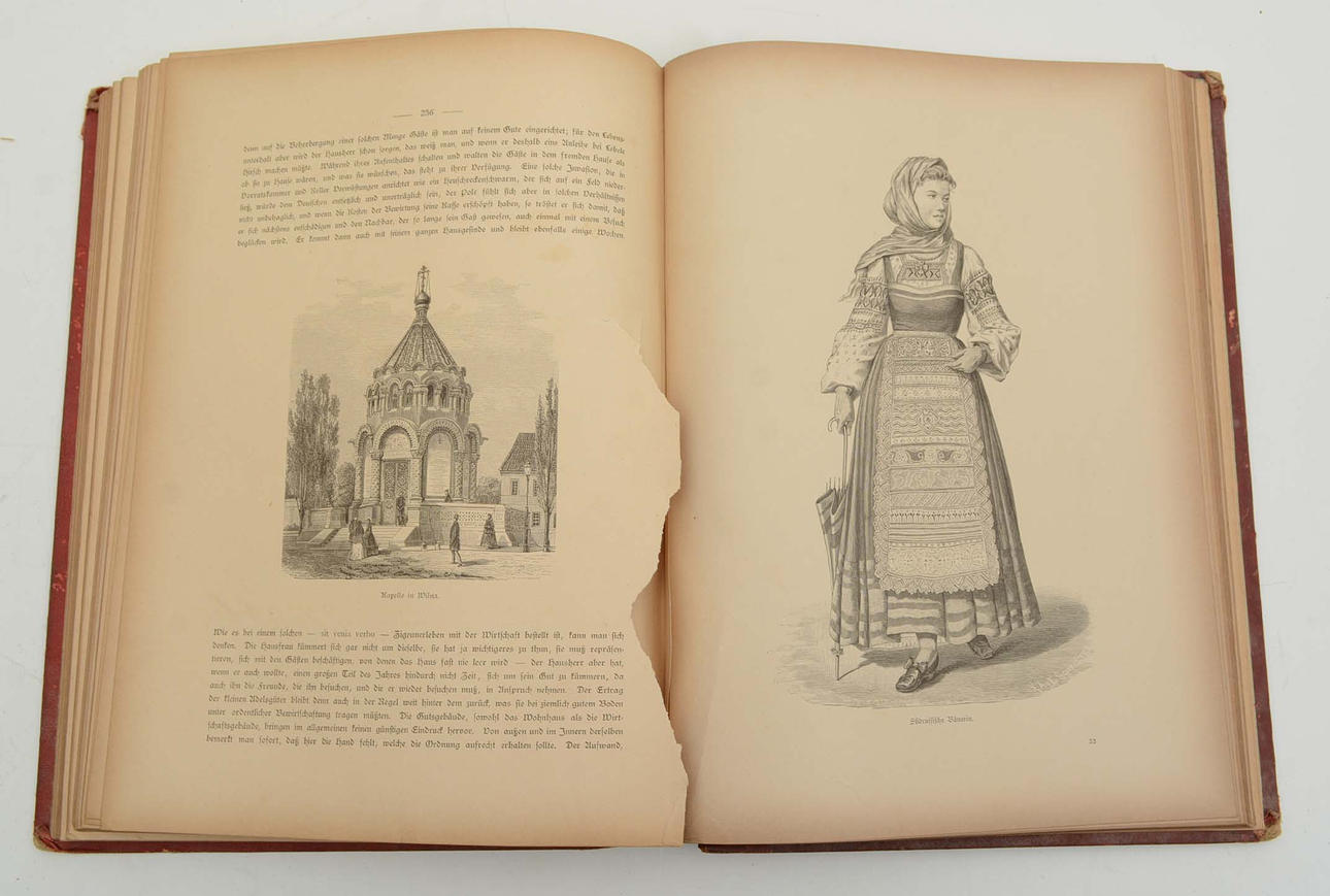 Gebrauchsspuren. 20 Seiten in Teil 1 und einige in Teil 2 mit umfangreichen Ansichten. Der Rücken und die Rückseite des Bandes sind abgenutzt.