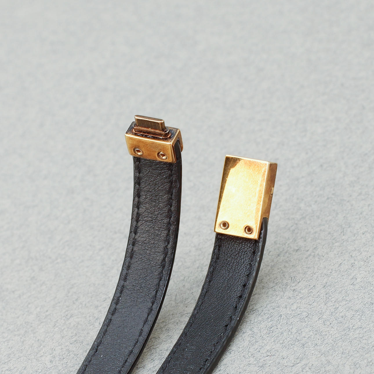 Schwarzes Leder mit Details aus gelbem Metall. Länge 36 cm.